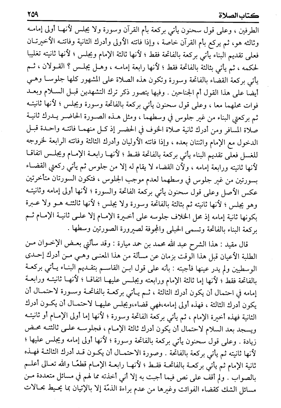 الطرفين وعلى قول سحنون يأتي بركعة بأم القرآن وسورة ولا يجلس لأنها أولى إمامه وثالثه هو، ثم يركع بأم القرآن خاصة وإذا فاتته الأولى وأدرك الثانية وفاتته الأخيرتان فعلى تقديم البناء يأتي بركعة بالفاتحة فقط لأنها ثالثة الإمام ويجلس لأنها ثانيته تغليبا لحكمه ثم يأتي بثالثة بالفاتحة فقط لأنها رابعة إمامه وهل يجلس] القولان ثم يأتي بركعة القضاء بالفاتحة وسورة وتكون هذه الصلاة على المشهور كلها جلوسا وهي أيضا على هذا القول أم الجناحين وفيها يتصور ذكر ترك التشهدين قبل السلام وبعد فوات محلهما معا وعلى قول سحنون يأتي بركعة بالفاتحة وسورة ويجلس لأنها ثانيته ثم بركعتي البناء من غير جلوس في وسطهما ومثل هذه الصورة