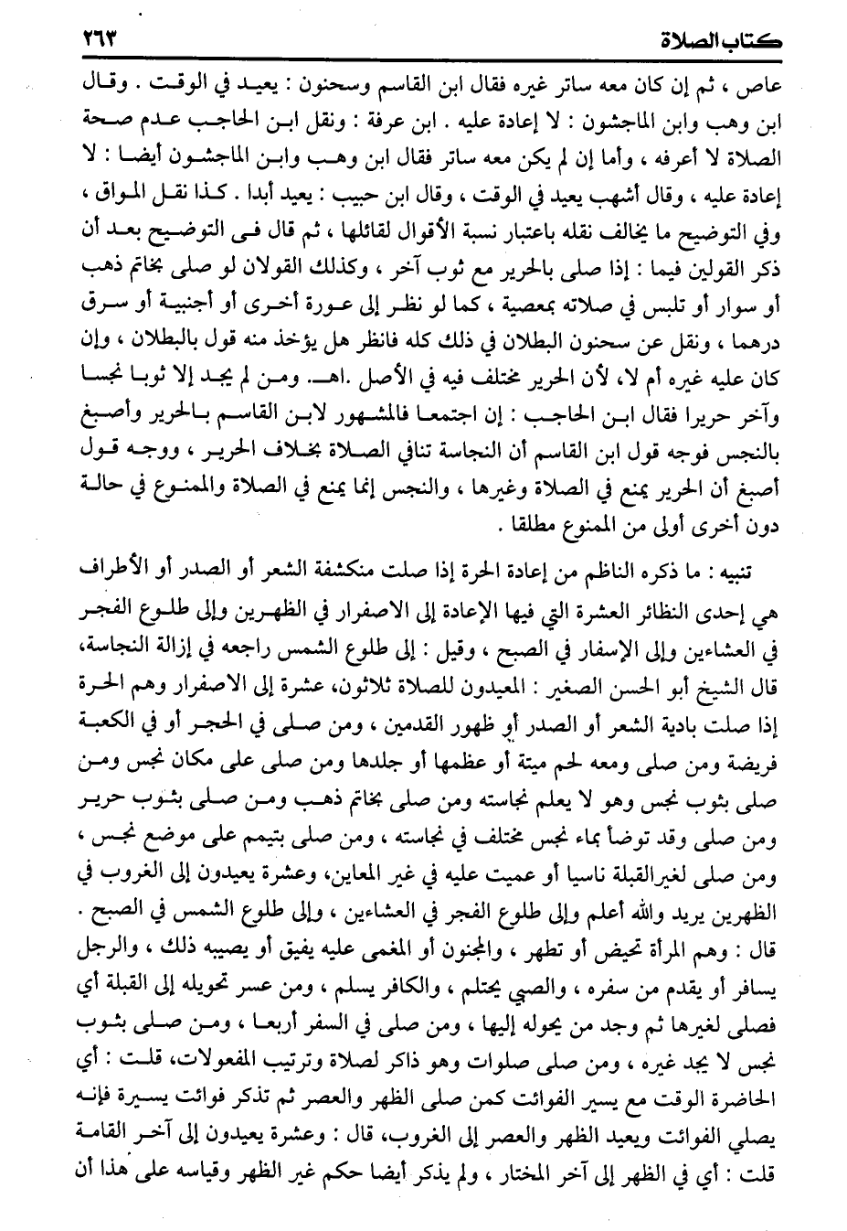 (تنبيه) ما ذكره الناظم من إعادة الحرة إذا صلت منكشفة الشعر أو الصدر أو الأطراف هي إحدى النظائر العشرة التي فيها الإعادة إلى الاصفرار في الظهرين وإلى طلوع الفجر في العشاءين وإلى الإسفار في الصبح وقيل إلى طلوع الشمس راجعه في إزالة النجاسة، قال الشيخ أبو الحسن الصغير المعيدون للصلاة ثلاثون، عشرة إلى الاصفرار وهم الحرة إذا صلت بادية الشعر أوالصدر أو ظهور القدمين ومن صلى في الحجر أو في الكعبة فريضة ومن صلى ومعه لحم ميتة أو عظمها أو جلدها ومن صلى على مكان نجس ومن صلى بثوب نجس وهو لا يعلم نجاسته ومن صلى بخاتم ذهب ومن صلى بثوب حرير ومن صلى وقد توضأ بماء نجس مختلف في نجاسته ومن صلى بتيمم على موضع نجس ومن صلى لغيرالقبلة ناسيا أو عميت عليه في غير المعاين، وعشرة يعيدون إلى الغروب في الظهرين يريد والله أعلم وإلى طلوع الفجر في العشاءين وإلى طلوع الشمس في الصبح قال وهم المرأة تحيض أو تطهر والمجنون أو المغمى عليه يفيق أو يصيبه ذلك والرجل يسافر أو يقدم من سفره والصبي يحتلم والكافر يسلم ومن عسر تحويله إلى القبلة أي فصلى لغيرها ثم وجد من يحوله إليها ومن صلى في السفر أربعا ومن صلى بثوب نجس لا يجد غيره ومن صلى صلوات وهو ذاكر لصلاة وترتيب المفعولات، قلت أي الحاضرة الوقت مع يسير الفوائت كمن صلى الظهر والعصر ثم تذكر فوائت يسيرة فإنه يصلي الفوائت ويعيد الظهر والعصر إلى الغروب، قال وعشرة يعيدون إلى آخر القامة قلت أي في الظهر إلى آخر المختار ولم يذكر أيضا حكم غير الظهر وقياسه على هذا أن