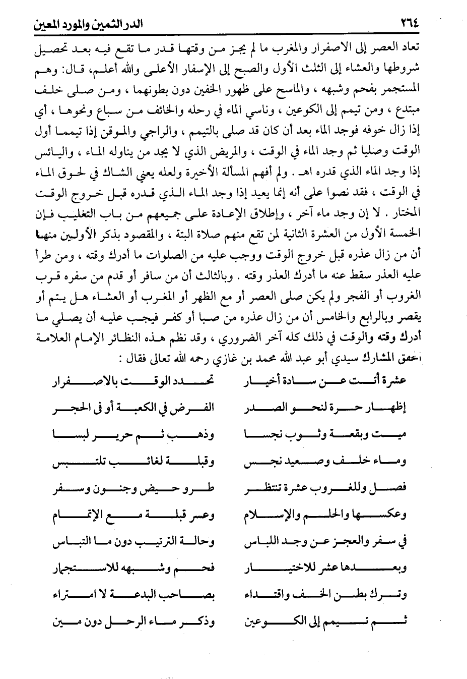 ولم أفهم المسألة الأخيرة ولعله يعني الشاك في لحوق الماء في الوقت فقد نصوا على أنه إنما يعيد إذا وجد الماء الذي قدره قبل خروج الوقت المختار لا إن وجد ماء آخر وإطلاق الإعادة على جميعهم من باب التغليب فإن الخمسة الأول من العشرة الثانية لمن تقع منهم صلاة البتة والمقصود بذكر الأولين منها أن من زال عذره قبل خروج الوقت ووجب عليه من الصلوات ما أدرك وقته ومن طرأ عليه العذر سقط عنه ما أدرك العذر وقته وبالثالث أن من سافر أو قدم من سفره قرب الغروب أو الفجر ولم يكن صلى العصر أو مع الظهر أو المغرب أو العشاء هل يتم أو يقصر وبالرابع والخامس أن من زال عذره من صبأ أو كفر فيجب عليه أن يصلي ما أدرك وقته والوقت في ذلك كله آخر الضروري وقد نظم هذه النظائر الإمام العلامة المحقق المشارك سيدي أبو عبد الله محمد بن غازي رحمه الله تعالى فقال