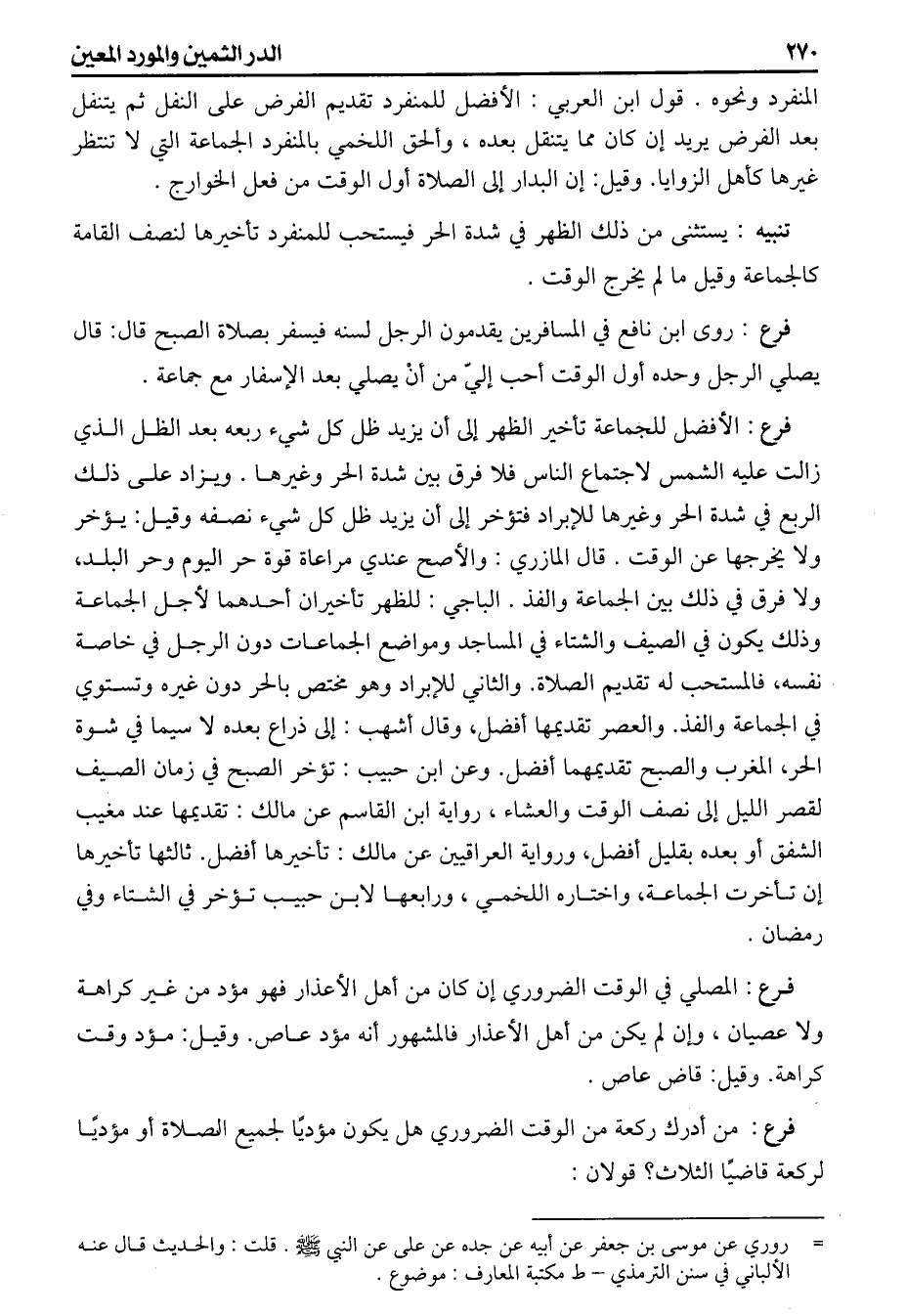 المنفرد ونحوه قول ابن العربي الأفضل للمنفرد تقديم الفرض على النفل ثم ينتقل بعد الفرض يريد إن كان مما يتنقل بعده وألحق اللخمي بالمنفرد الجماعة التي لا تنتظر غيرها كأهل الزوايا. وقيل: إن البدار إلى الصلاة أول الوقت من فعل الخوارج