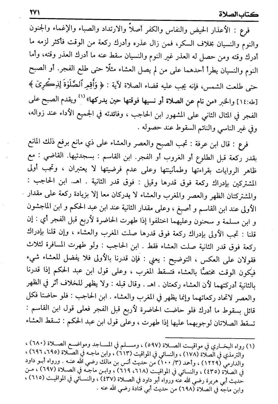(فرع) الأعذار الحيض والنفاس والكفر أصلا وارتدادا والصباء والإغماء والجنون والنوم والنسيان بخلاف السكر، فمن زال عذره وأدرك ركعة من الوقت فأكثر لزمه ما أدرك وقته ومن حصل له العذر غير النوم والنسيان سقط عنه ما أدرك العذر وقته، وأما النوم والنسيان يطرأ أحدهما على من لم يصل العشاء مثلا حتى طلع الفجر. أو الصبح حتى طلعت الشمس، فإنه يجب عليه قضاء الصلاة لآية {أقم الصلاة لذكري} ولخبر (من نام عن الصلاة أو نسيها فوقتها حين يدركها) ويقدم الصبح على الفجر في المثال الثاني على المشهور ابن الحاجب؟ وفائدته في الجميع الأداء عند زواله، وفي غير الناسي والنائم السقوط عند حصوله
