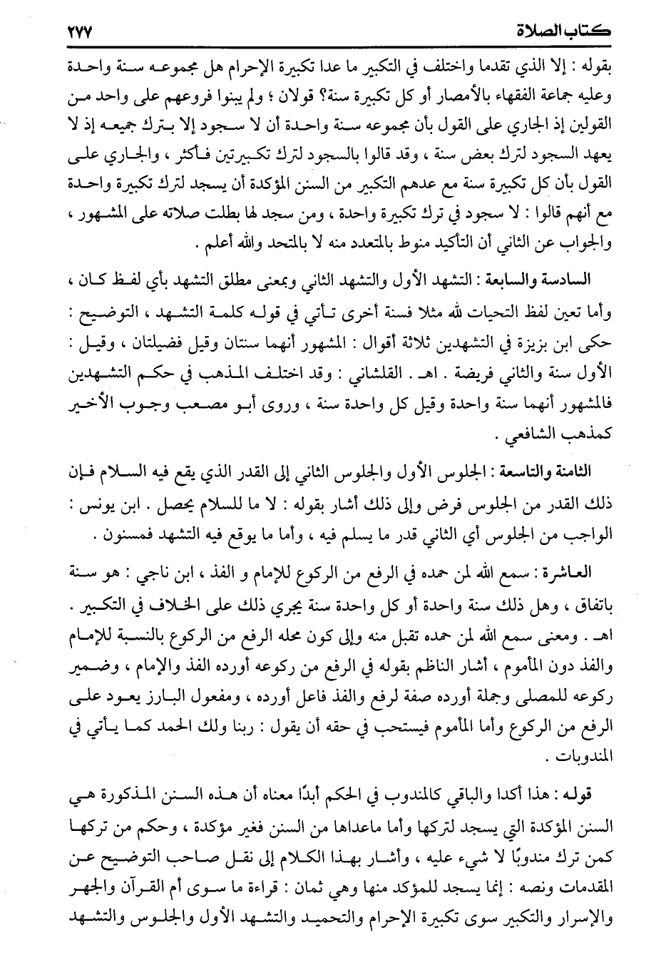 الثامنة والتاسعة الجلوس الأول والجلوس الثاني إلى القدر الذي يقع فيه السلام فإن ذلك القدر من الجلوس فرض وإلى ذلك أشار بقوله لا ما للسلام يحصل ابن يونس الواجب من الجلوس أي الثاني قدر ما يسلم فيه وأما ما يوقع فيه التشهد فمسنون العاشرة سمع الله لمن حمده في الرفع من الركوع ل لإمام والفذ ابن ناجي هو سنة باتفاق وهل ذلك سنة واحدة أو كل واحدة سنة يجري ذلك على الخلاف في التكبير اهـ