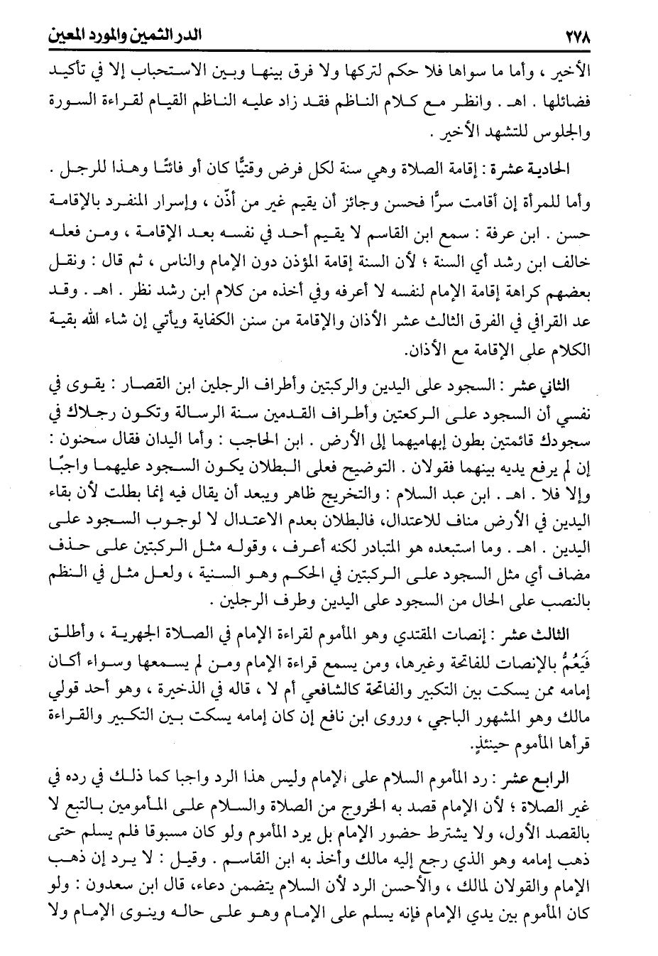 الرابع عشر رد المأموم السلام وليس هذا الرد واجبا كما ذلك في رده في غير الصلاة لأن الإمام قصد به الخروج من الصلاة والسلام على المأمومين بالتبع لا بالقصد الأول، ولا يشترط حضور الإمام بل يرد المأموم ولو كان مسبوقا فلم يسلم حتى ذهب إمامه وهو الذي رجع إليه مالك وأخذ به ابن القاسم وقيل لا يرد إن ذهب الإمام والقولان ل مالك، والأحسن الرد لأن السلام يتضمن دعاء، قال ابن سعدون ولو كان المأموم بين يدي الإمام فإنه يسلم على الإمام وهو على حاله وينوى الإمام ولا