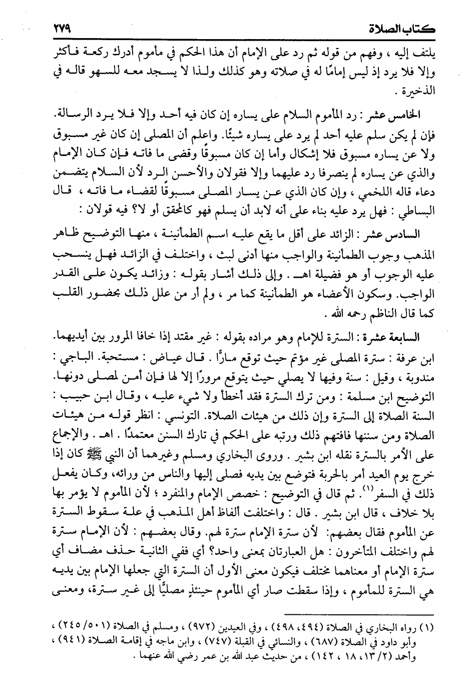 السابعة عشرة السترة للإمام وهو مراده بقوله غير مقتد إذا خافا المرور بين أيديهما/ ابن عرفة سترة المصلى غير مؤتم حيث توقع مارا قال عياض مستحبة/ الباجي مندوبة وقيل سنة وفيها لا يصلى حيث يتوقع مرورا إلا لها فإن أمن لمصلى دونها، التوضيح ابن مسلمة ومن ترك السترة فقد أخطأ ولا شيء عليه، وقال ابن حبيب السنة الصلاة إلى السترة وإن ذلك من هيئات الصلاة/ التونسي انظر قوله من هيئات الصلاة ومن سننها فافتهم ذلك ورتبه على الحكم في تارك السنن معتمدا اهـ، والإجماع على الأمر بالسترة نقله ابن بشير وروى البخاري ومسلم وغيرهما أن النبي كان إذا خرج يوم العيد أمر بالحرية فتوضع بين يديه فصلى إليها والناس من ورائه. وكان يفعل ذلك في السفر. ثم قال في التوضيح خصص الإمام والمنفرد لأن المأموم لا يؤمر بها بلا خلاف قال ابن بشير. قال واختلفت ألفاظ أهل المذهب في علة سقوط السترة عن المأموم فقال بعضهم لأن سترة الإمام سترة لهم. وقال بعضهم لأن الإمام سترة لهم واختلف المتأخرون هل العبارتان بمعنى واحد أي ففي الثانية حذف مضاف أي سترة الإمام أو معناهما مختلف فيكون معنى الأول أن السترة التي جعلها الإمام بين يديه هي السترة للمأموم وإذا سقطت صار أي المأموم حينئذ مصليا إلى غير سترة، ومعنى