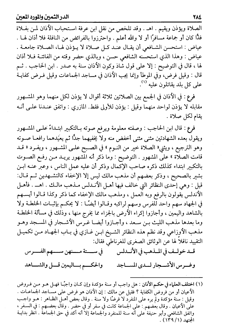(فرع) قال ابن الحاجب وصفته معلومة ويرفع صوته بالتكبير ابتداء على المشهور ويقول بعده الشهادتين مثنى مثنى أخفض منه ولا يخفيهما جدا ثم يعيدهما رافعا صوته وهو الترجيع ويثني (الصلاة خير من النوم) في الصبح على المشهور ويفرد قد قامت الصلاة على المشهور التوضيح وما ذكر أنه المشهور يريد من رفع الصوت بالتكبير ابتداء كذلك ذكره صاحب الإكمال وذكر أن عليه عمل الناس وعبر عنه ابن بشير بالصحيح وذكر بعضهم أن مذهب مالك ليس إلا الإخفاء كالتشهدين ثم قال: قيل وهي إحدى النظائر التي خالف فيها أهل الأندلس مذهب مالك اهـ، فأهل الأندلس يقولون بالرفع وبه العمل ومذهب مالك الإخفاء كما ذكر وكذا قالوا أيسهم في الجهاد سهم واحد للفرس وسهم لراكبه وقالوا أيضا لا يحكم بإثبات الخلطة ولا بالشاهد واليمين وأجازوا إكراء الأرض بالجزء مما يخرج منها وذلك في مسألة الخلطة وما بعدها مذهب الليث بن سعد وأجازوا أيضا غرس الأشجار في المسجد وهو مذهب الأوزاعي وقد نظم هذه النظائر الشيخ ابن غازي في باب الجهاد من تكميل التقييد ناقلاً لها عن الوثائق الصغرى لـ الغرناطي فقال: