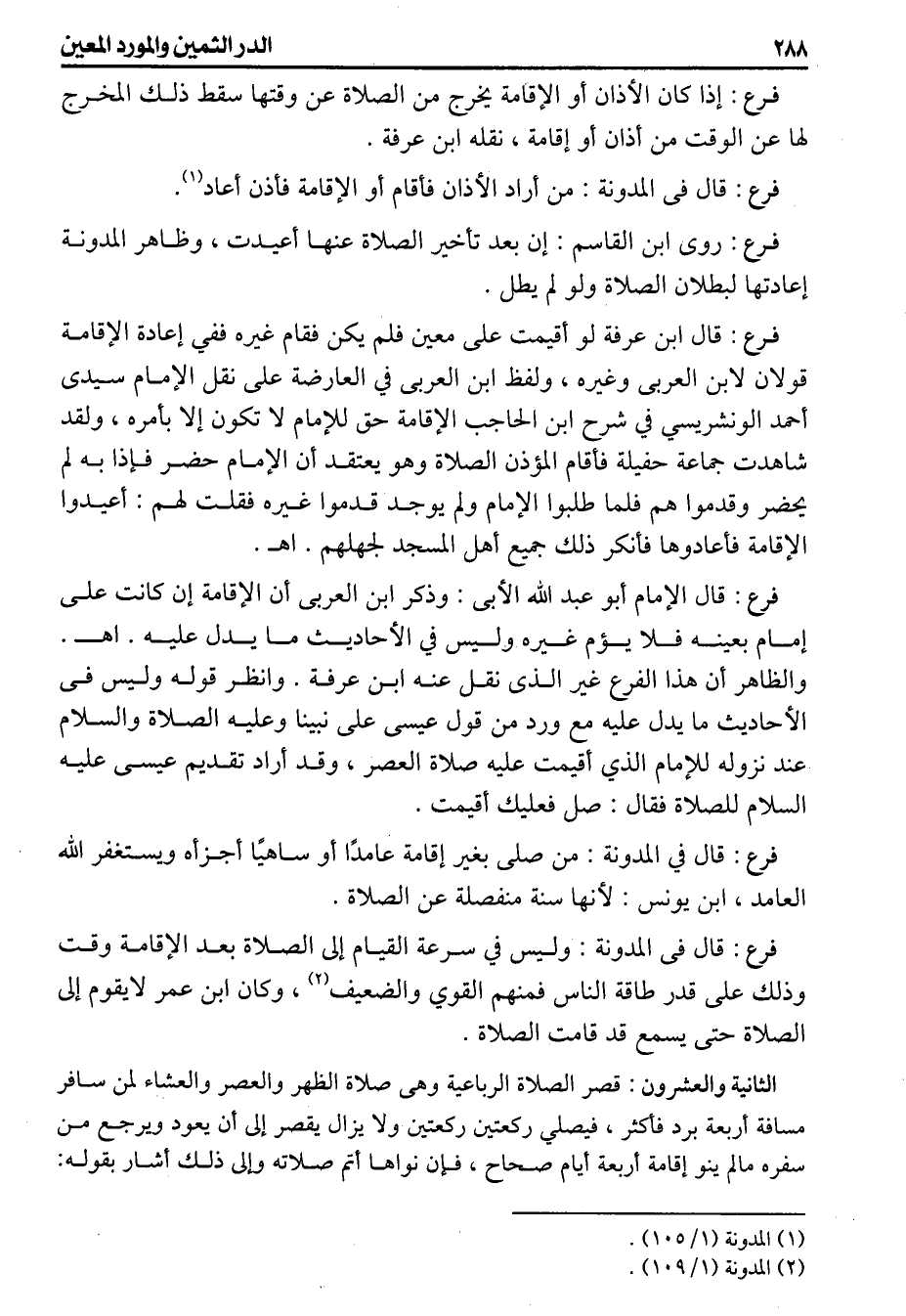 والظاهر أن هذا الفرع غير الذى نقل عنه ابن عرفة وانظر قوله وليس فى الاحاديث مايدل عليه مع ورد من قول عيسى على نبينا وعليه الصلاة والسلام عند نزوله للإمام الذي أقيمت عليه صلاة العصر وقد أراد تقديم عيسى عليه السلام صل فعليك أقيمت