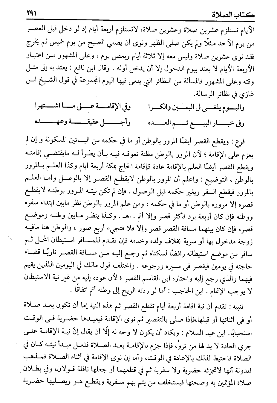 الأيام تستلزم عشرين صلاة وعشرين صلاة، لاتستلزم أربعة أيام إذ لو دخل قبل العصر من يوم الأحد مثلا ولم يكن صلى الظهر ونوى أن يصلي الصبح من يوم خميس ثم يخرج فقد نوى عشرين صلاة وليس معه إلا ثلاثة أيام وبعض يوم وعلى المشهور من اعتبار الأربعة الايام لايعتد بيوم الدخول إلا أن يدخل أوله وقال ابن نافع يعتد به إلى مثل وقته وعلى المشهور فالمسألة من النظائر التي يلغى فيها اليوم المجموعة في قول الشيخ ابن غازي في نظائر الرسالة.
