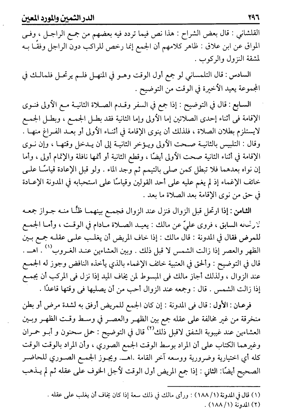 القلشاني قال بعض الشراح هذا نص فيما تردد فيه بعضهم من جمع الراجل وفى المواق عن ابن علاق ظاهر كلامهم أن الجمع إنما رخص للراكب دون الراجل وفقا به لمشقة النزول والركوب، السادس قال التلمساني لو جمع أول الوقت وهو في المنهل فلم يرتحل فلمالك في المجموعة يعيد الأخيرة في الوقت من التوضيح، السابع قال في التوضيح إذا جمع في السفر وقدم الصلاة الثانية مع الأولى فنوى الإقامة فى أثناء إحدى الصلاتين إما الأولى وإما الثانية فقد بطل الجمع، وبطل الجمع لايستلزم بطلان الصلاة فلذلك أن ينوى الإقامة في أثناء الأولى أو بعد الفراغ منها وقال التلبيس بالثانية صحت الأولى ويؤخر الثانية إلى أن يدخل وقتها وإن نوى الإقامة في أثناء الثانية صحت الأولى أيضا وقطع الثانية أو أتمها نافلة والإتمام أولى وأما إن نواه بعدهما فلا تبطل كمن صلى بالتيمم ثم وجد الماء ولو قبل الإعادة قياسا على خائف الإغماء إذ لم يغم عليه على أحد القولين وقياسا على استحبابه في المدونة الاعادة في حق من نوى الإقامة بعد الصلاة مابعد الثامن اذا ارتحل قبل الزوال فنزل عند الزوال فجمع بينهما ظنا منه جواز جمعه لارتحاله السابق فروى علي عن مالك يعيد الصلاة مادام في الوقت وأما الجمع للمرض فقال في المدونة قال مالك إذا خاف المريض أن يغلب على عقله جمع بين الظهر والعصر إذا زالت الشمس لاقبل ذلك وبين العشاءين عند الغروب اهـ قال في التوضيح وألحق في العتبية خائف الإغماء بالذي يأخذه النافض وجوز له الجمع عند الزوال ولذلك أجاز مالك فى المبسوط لمن يخاف الميد إذا نزل فى المركب أن يجمع إذا زالت الشمس قال وجمعه عند الزوال أحب من أن يصليها فى وقتها قاعداً