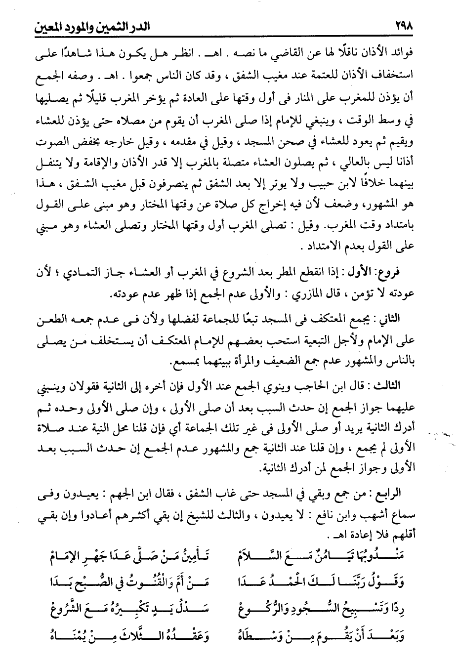 (فروع) الأول إذا انقطع المطر بعد الشروع في المغرب أو العشاء جاز التمادى لأن عودته لاتؤمن قال المازري والأولى عدم الجمع إذا ظهر عدم عودته، الثاني يجمع المعتكف فى المسجد تبعاً للجماعة لفضلها ولأن فى عدم جمعه الطعن على الإمام ولأجل التبعية استحب بعضهم للإمام المعتكف أن يستخلف من يصلى بالناس والمشهور عدم جمع الضعيف والمرأة ببيتهما بمسمع، الثالث قال ابن الحاجب وينوي الجمع عند الأول فإن أخره إلى الثانية فقولان وينبني عليهما جواز الجمع إن حدث السبب بعد أن صلى الأولى وإن صلى الأولى وحده ثم أدرك الثانية يريد أو صلى الأولى فى غير تلك الجماعة أي فإن قلنا محل النية عند صلاة الأولى لم يجمع وإن قلنا عند الثانية جمع والمشهور عدم الجمع إن حدث السبب بعد الأولى وجواز الجمع لمن أدرك الثانية، الرابع من جمع وبقي في المسجد حتى غاب الشفق فقال ابن الجهم يعيدون وفى سماع أشهب وابن نافع لايعيدون والثالث للشيخ إن بقي أكثرهم أعادوا وإن بقي أقلهم فلا اعادة اهـ