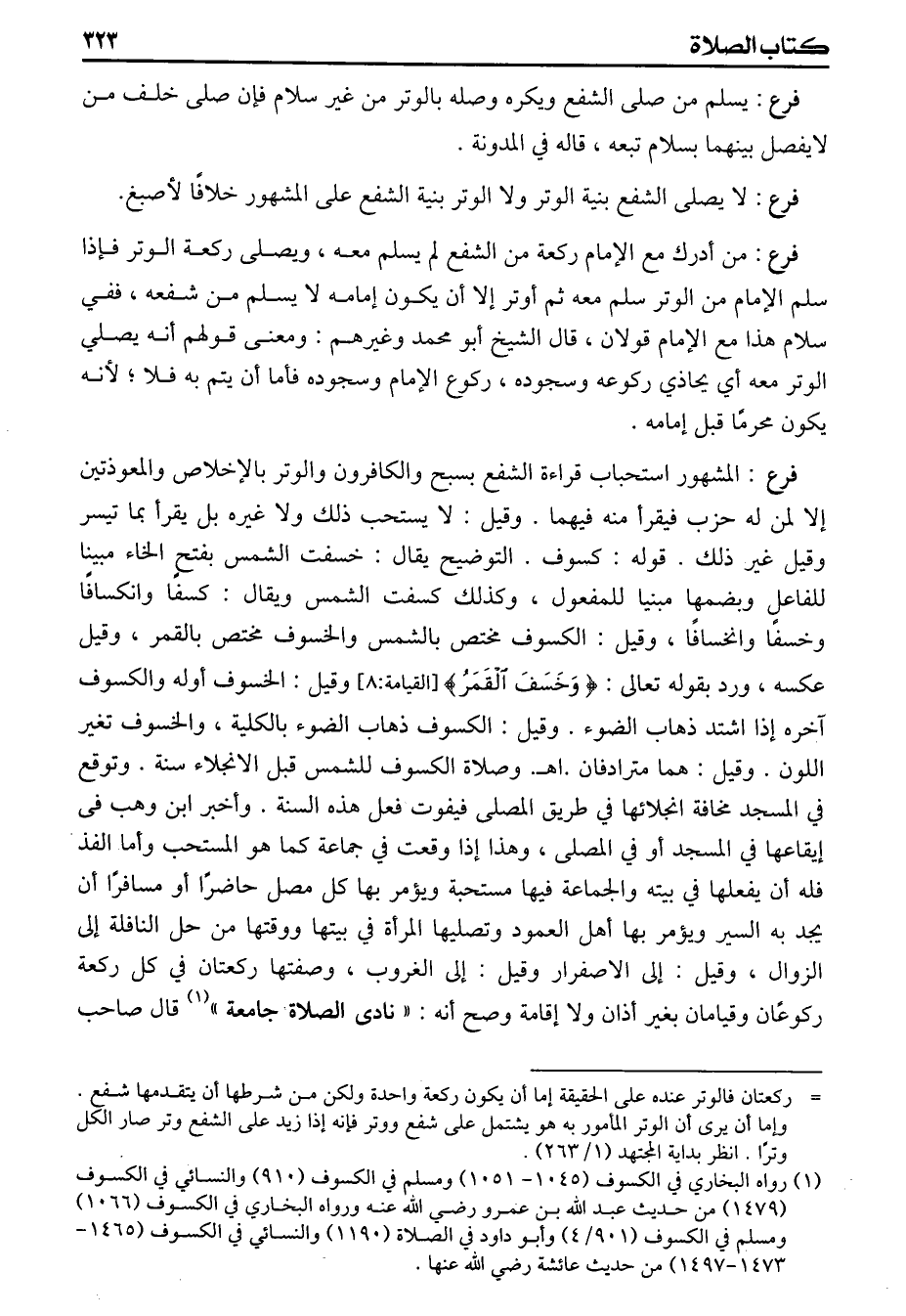(فرع) من أدرك مع الإمام ركعة من الشفع لم يسلم معه ويصلى ركعة الوتر فإذا سلم الإمام من الوتر سلم معه ثم أوتر إلا أن يكون أمامه لايسلم من شفعه ففي سلام هذا مع الإمام قولان قال الشيخ أبو محمد وغيرهم ومعنى قولهم أنه يصلي الوتر معه أي يحاذي ركوعه وسجوده ركوع الإمام وسجوده فأما أن يتم به فلا لأنه يكون محرماً قبل إمامه (فرع) المشهور استحباب قراءة الشفع يسبح والكافرون والوتر بالاخلاص والمعوذتين إلا لمن له حزب فيقرأ منه فيهما وقيل لايستحب ذلك ولاغيره بل يقرأ بما تيسر وقيل غير ذلك قوله كسوف التوضيح يقال خسفت الشمس بفتح الخاء مبينا للفاعل وبضمها مبنيا للمفعول وكذلك كسفت الشمس ويقال كسفا وانكسافا وخسفاً وانخسافا وقيل الكسوف مختص بالشمس والخسوف مختص بالقمر وقيل عكسه ورد بقوله تعالى {وخسف القمر} وقيل الخسوف أوله والكسوف آخره إذا اشتد ذهاب الضوء وقيلى الكسوف ذهاب الضوء بالكلية والخسوف تغير اللون وقيل هما مترادفان وصلاة الكسوف للشمس قبل الانجلاء سنة وتوقع في المسجد مخافة انجلائها في طريق المصلى فيفوت فعل هذه السنة واخبر ابن وهب فى إيقاعها في المسجد أو في المصلى وهذا إذا وقعت في جماعة كما هو المستحب وأما الفذ فله أن يفعلها في بيته والجماعة فيها مستحبة ويؤمر بها كل مصل حاضراً أو مسافراً إن أن يجد به السير ويؤمر بها أهل العمود وتصليها المرأة في بيتها ووقتها من حل النافلة إلى الزوال وقيل إلى الاصفرار وقيل إلى الغروب وصفتها ركعتان في كل ركعة ركوعان وقيامان بغير أذان ولااقامة وصح أنه نادى الصلاة جامعة قال صاحب