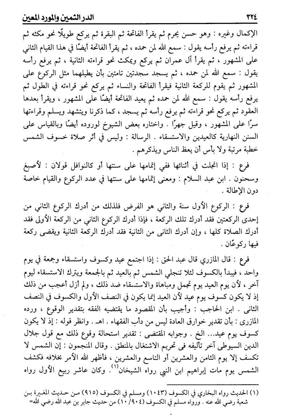 الاكمال وغيره وهو حسن يحرم ثم يقرأ الفاتحة ثم البقرة ثم يركع طويلا نحو مكته ثم قراءته ثم يرفع رأسه يقول سمع الله لمن حمده ثم يقرأ الفاتحة أيضا في هذا القيام الثاني على المشهور ثم يقرأ آل عمران ثم يركع ويمكث نحو قراءته الثانية ثم يرفع رأسه يقول سمع الله لمن حمده ثم يسجد سجدتين تامتين بأن