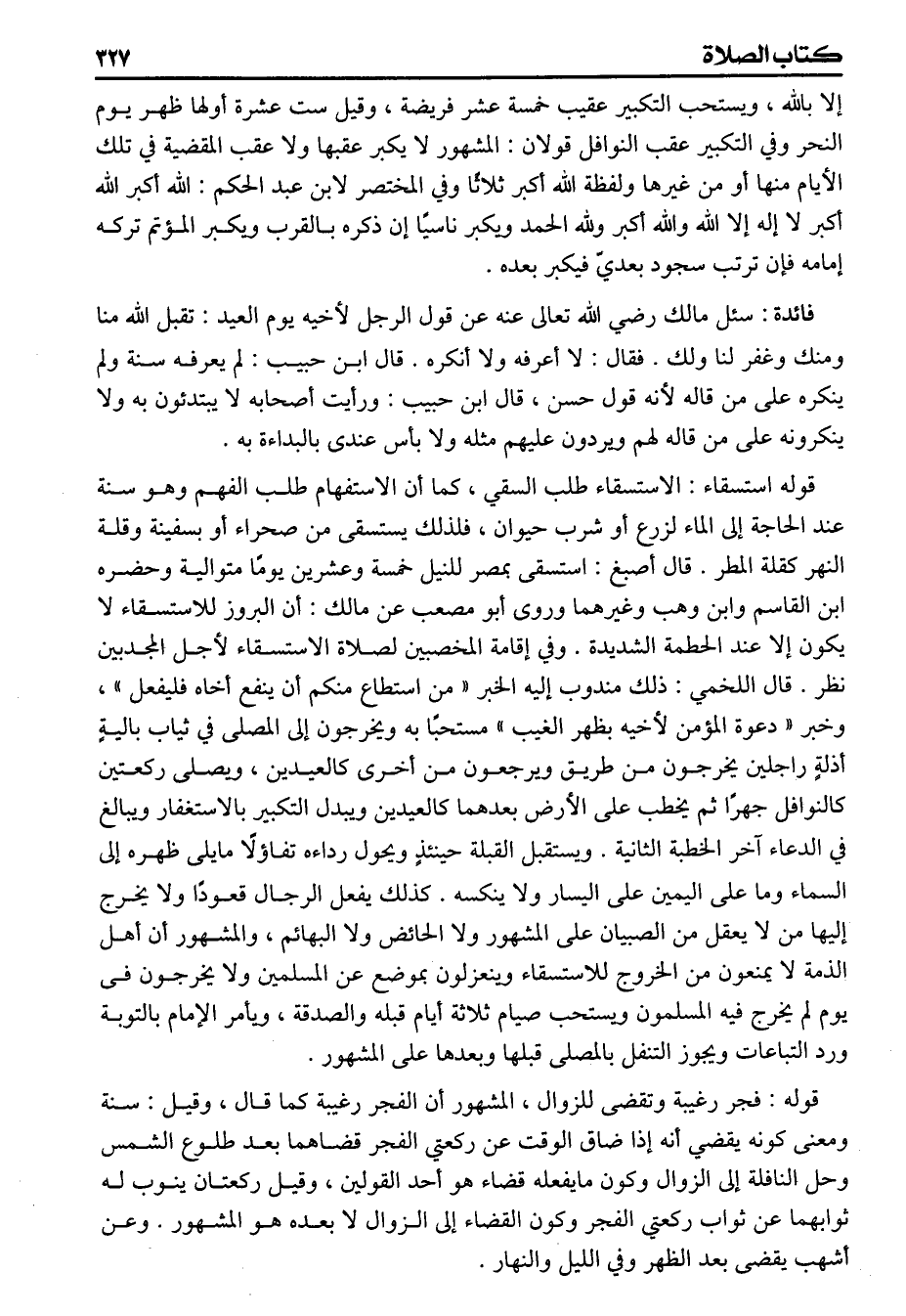 إلا بالله ويستحب التكبير عقيب خمسة عشر فريضة وقيل ست عشرة أولها ظهر يوم النحر وفي التكبير عقب النوافل قولان المشهور لايكبر عقبها ولاعقب المقضية في تلك الأيام منها أو من غيرها ولفظة الله أكبر ثلاثا وفي المختصر لابن عبد الحكم الله أكبر الله أكبر لا إله إلا الله والله أكبر ولله الحمد ويكبر ناسياً إن ذكره بالقرب ويكبر المؤتم تركه امامه فإن ترتب سجود بعدى فيكبر بعده (فائدة) سئل مالك رضي الله تعالى عنه عن قول الرجل لأخيه يوم العيد تقبل الله منا ومنك وغفر لنا ولك فقال لا أعرفه ولا أنكره قال ابن حبيب لم يعرفه سنة ولم ينكره على من قاله لأنه قول حسن قال ابن حبيب ورأيت أصحابه لايبتدئون به ولاينكرونه على من قاله ويردون عليهم مثله ولا بأس عندى بالبداءة به. قوله استسقاء: الاستسقاء طلب السقي كما أن الاستفهام طلب الفهم وهو سنة عند الحاجة إلى الماء لزرع أو شرب حيوان فلذلك يستسقى من صحراء أو بسفينة وقلة النهر كقلة المطر قال أصبغ استسقى بمصر للنيل خمسة وعشرين يوما متوالية وحضره ابن القاسم وابن وهب وغيرهما وروى أبو مصعب عن مالك أن البروز للاستسقاء لايكون إلا عند الحطمة الشديدة وفي إقامة المخصبين لصلاة الاستسقاء لأجل المجد بين نظر قال اللخمي ذلك مندوب إليه الخبر من استطاع منكم أن ينفع أخاه فليفعل وخبر دعوة المؤمن لأخيه بظهر الغيب مستحبابه ويخرجون إلى المصلى في ثياب بالية أذلة راجلين يخرجون من طريق ويرجعون من أخرى كالعيدين ويصلى ركعتين كالنوافل جهراً ثم يخطب على الأرض بعدهما كالعيدين ويبدل التكبير بالاستغفار ويبالغ في الدعاء آخر الخطبة الثانية ويستقبل القبلة حينئذ ويحول رداءه تفاؤلا مايلى ظهره إلى السماء وما على اليمين على اليسار ولا ينكسه كذلك يفعل الرجال قعودا ولا يخرج إليها من لايعقل من الصبيان على المشهور ولا الحائض ولا البهائم والمشهور أن أهل الذمة لايمنعون من الخروج للاستسقاء وينعزلون بموضع عن المسلمين ولايخرجون فى يوم لم يخرج فيه المسلمون ويستحب صيام ثلاثة أيام قبله والصدقة ويأمر الإمام بالتوبة ورد التباعات ويجوز التنفل بالمصلى قبلها وبعدها على المشهور قوله فجر رغيبة وتقضى للزوال المشهور أن الفجر رغيبة كما قال وقيل سنة ومعنى كونه يقضي أنه إذا ضاق الوقت عن ركعتي الفجر قضاهما بعد طلوع الشمس وحل النافلة إلى الزوال وكون مايفعله قضاء هو أحد القولين وقيل ركعتان ينوب له ثوابهما عن ثواب ركعتي الفجر وكون القضاء إلى الزوال لا بعده هو المشهور وعن أشهب يقضى بعد الظهر وفي الليل والنهار