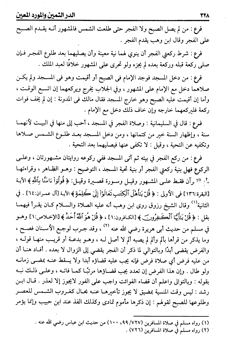 (فرع) من لم يصل الصبح ولا الفجر حتى طلعت الشمس فالمشهور أنه يقدم الصبح على الفجر وقال ابن وهب يقد الفجر (فرع) شرط ركعتي الفجر أن ينوي لهما نية معينة وأن يصليهما بعد طلوع الفجر فإن صلى ركعة قبله وركعة بعده لم يجزه ولو تحرى على المشهور خلافا لعبد الملك (فرع) من دخل المسجد فوجد الإمام فى الصبح أو أقيمت وهو فى المسجد ولم يكن صلاهما دخل مع الإمام على المشهور وفي الجلاب يخرج ويركعهما إن اتسع الوقت وأما إن أقيمت عليه الصبح وهو خارج المسجد فقال مالك فى المدونة إن لم يحف فوات ركعة فليركعهما خارجه وإن خاف ذلك دخل مع الامام (فرع) قال في السليمانية وصلاة الفجر في المسجد أحب إلى منها في البيت لأنهما سنة وإظهار السنة خير من كتمانها ومن دخل المسجد بعد طلوع الشمس صلاها وتكفيه عن التحية وقيل لاتكفى عنها فيصليهما بعد التحية (فرع) من ركع الفجر في بيته ثم أتى المسجد ففي ركوعه روايتان مشهورتان وعلى الركوع فهل بنية ركعتي الفجر أو بنية تحية المسجد التوضيح وهو الظاهر وقراءتها بأم القرآن فقط على المشهور وقيل وسورة قصيرة وقيل: {قولوا آمنا بالله} (الآية) فى الأولى {وقل ياأهل الكتاب تعالوا إلى كلمة} الآية. في الثانية وقل الشيخ رزوق روى ابن وهب أنه عليه الصلاة والسلام كان يقرأ فيهما بقل ياأيها الكافرون وقل هو الله أحد وهو في مسلم من حديث أبى هريرة رضي الله عنه وقد جرب لوجع الاسنان فصح وما يذكر من قرأها بألم وألم لم يصبه ألم لا أصل له وهو بدعة أو قريب منها قوله والفرض يقضى أبدأ وبالتوالي لما ذكر أن الفجر يقضي إلى الزوال لا بعده أفاد هنا أن من عليه فرض أي صلاة فرض فإنه يجب عليه قضاؤه أبدا ولا يسقط عنه بمضى زمانه ولو طال وإن هذا الفرض إن تعدد يجب قضاؤها مرتبا كما فاته وعلى ذلك نبه بقوله وبالتوالى واعلم أن قضاء الفوائت واجب على الفور لايجوز إلا لعذر قال ابن رشد ليس وقت المنسية بمضيق لايجوز تأخيرها عنه بحال كغروب الشمس للعصر وطلوعها للصبح لقولهم إن ذكرها مأموم تمادى وكذلك الفذ عند ابن حبيب وإنما يؤمر