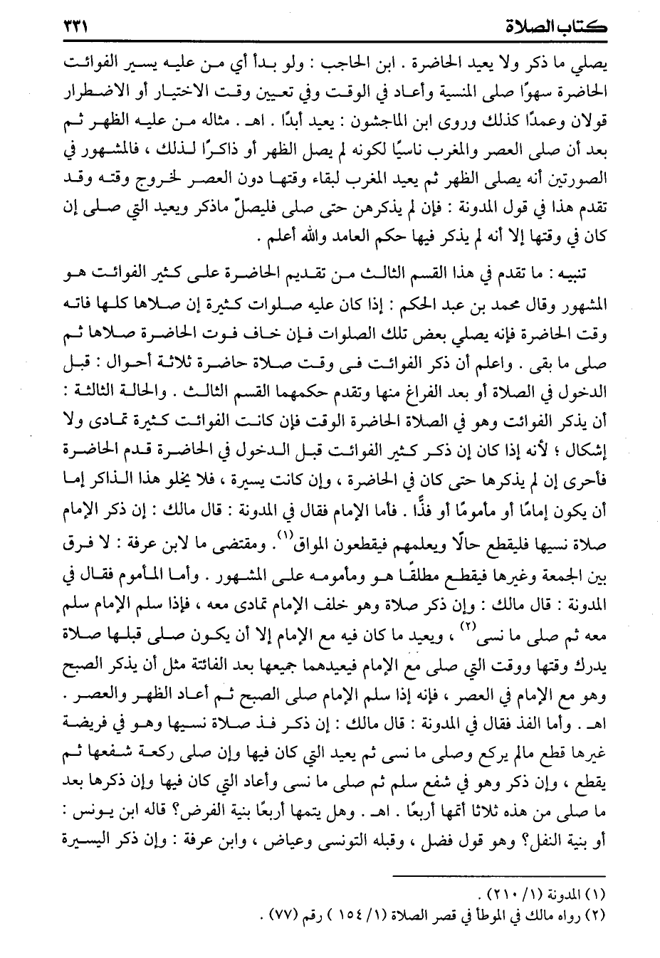 يصلي ماذكر ولايعيد الحاضرة ابن الحاجب ولو بدأ أي من عليه يسير الفوائت الحاضرة سهواً صلى المنسية وأعاد في الوقت وفي تعيين وقت الاختيار أو الاضطرار قولان وعمدا كذلك وروى ابن الماجشون يعيد أبدا اهـ مثاله من عليه الظهر ثم بعد أن صلى العصر والمغرب ناسيا لكونه لم يصل الظهر أو ذاكرا لذلك فالمشهور في الصورتين أنه يصلى الظهر ثم يعيد المغرب لبقاء وقتها دون العصر لخروج وقته وقد تقدم هذا في قول المدونة فان لم يذكرهن حتى صلى فليصل ماذكر ويعيد التي صلى إن كان في وقتها إلا أنه لم يذكر فيها حكم العامد والله أعلم (تنبيه) ماتقدم في هذا القسم الثالث من تقديم الحاضرة على كثير الفوائت هو المشهور وقال محمد بن عبد الحكم إذا كان عليه صلوات كثيرة إن صلاها كلها فاته وقت الحاضرة فإنه يصلي بعض تلك الصلوات فإن خاف فوت الحاضرة صلاها ثم صلى مابقى واعلم أن ذكر الفوائت فى وقت صلاة حاضرة ثلاثة أحوال قبل الدخول في الصلاة أو بعد الفراغ منها وتقدم حكمهما القسم الثالث والحالة الثالثة أن يذكر الفوائت وهو في الصلاة الحاضرة الوقت فإن كانت الفوائت كثيرة تمادى ولا اشكال لأنه إذا كان إن ذكر كثير الفوائت قبل الدخول في الحاضرة قدم الحاضرة فأحرى إن لم يذكرها حتى كان في الحاضرة وإن كانت يسيرة فلا يخلو هذا الذاكر إما أن يكون أماما أو مأموماً أو فذا فأما الإمام فقال في المدونة قال مالك إن ذكر الامام صلاة نسيها فليقطع مالا ويعلمهم فيقطعون المواق ومقتضى ما لابن عرفة لافرق بين الجمعة وغيرها فيقطع مطلقاً هو ومامومه على المشهور وأما المأموم فقال في المدونة قال مالك وإن ذكر صلاة وهو خلف الإمام تمادى معه فإذا سلم الإمام سلم معه ثم صلى مانسى ويعيد ماكان فيه مع الإمام إلا أن يكون صلى قبلها صلاة يدرك وقتها ووقت التي صلى مع الإمام فيعيدهما جميعها بعد الفائتة مثل أن يذكر الصبح وهو مع الإمام في العصر فإنه إذا سلم الامام صلى الصبح ثم أعاد الظهر والعصر اهـ وأما الفذ فقال في المدونة قال مالك إن ذكر فذ صلاة نسيها وهو في فريضة غيرها قطع مالم يركع وصلى مانسى ثم يعيد التي كان فيها وإن صلى ركعة شفعها ثم يقطع وإن ذكر وهو في شفع سلم ثم صلى مانسى وأعاد التي كان فيها وإن ذكرها بعد ماصلى من هذه ثلاثا أتمها أربعا اهـ وهل يتمها أربعا بنية الفرض قاله ابن يونس أو بنية النقل وهو قول فضل وقبله التونسى وعياض وابن عرفة وإن ذكر اليسيرة