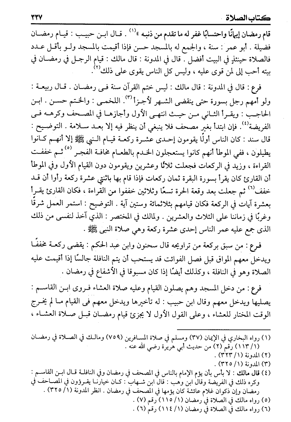 قام رمضان إيماناً واحتساباً غفر له ماتقدم من ذنبه قال ابن حبيب قيام رمضان فضيلة أبو عمر سنة والجمع له بالمسجد حسن فإذا أقيمت بالمسجد ولو بأقل عدد فالصلاة حينئذ في البيت أفضل قال في المدونة قال مالك قيام الرجل في رمضان في بيته أحب الى لمن قوى عليه وليس كل الناس يقوى على ذلك (فرع) قال في المدونة قال مالك ليس ختم القرآن سنة فى رمضان قال ربيعة ولو أمهم رجل بسورة حتى ينقضى الشهر لاجزأ اللخمى والختم حسن ابن الحاجب ويقرأ الثاني من حيث انتهى الأول وأجازها في المصحف وكرهه فى الفريضة فإن أبتدأ بغير مصحف فلا ينبغي أن ينظر فيه إلا بعد سلامة التوضيح قال سند كان الناس أولا يقومون إحدى عشرة ركعة قيام النبي إلا أنهم كانوا يطيلون ففي الموطأ أنهم كانوا يستعجلون الخدم بالطعام مخافة الفجر ثم خففت القراءة وزيد في الركعات فجعلت ثلاثا وعشرين ويقومون دون القيام الأول وفي الموطإ أن القارىء كان يقرأ بسورة البقرة ثمان ركعات فإذا قام بها باثنتى عشرة ركعة رأوا أن قد خفف ثم جعلت بعد وقعة الحرة تسعا وثلاثين خففوا من القراءة فكان القارىء يقرأ بعشرة آيات في الركعة فكان قيامهم بثلاثمائة وستين آية التوضيح استمر العمل شرقا وغربا في زماننا على الثلاث والعشرين ولمالك في المختصر الذي آخذ لنفسى من ذلك الذى جمع عليه عمر الناس إحدى عشرة ركعة وهي صلاة النبى (فرع) من سبق بركعة من تراويحه قال سحنون وابن عبد الحكم يقضى ركعة مخففا ويدخل معهم المواق قبل فصل الفوائت قد يستحب أن يتم النافلة جالسا إذا أقيمت عليه الصلاة وهو في النافلة وكذلك أيضا إذا كان مسبوقا في الأشفاع في رمضان (فرع) من دخل المسجد وهم يصلون القيام وعليه صلاة العشاء فروى ابن القاسم يصليها ويدخل معهم وقال ابن حبيب له تأخيرها ويدخل معهم فى القيام مالم يخرج الوقت المختار للعشاء وعلى القول الأول لايجزىء قيام رمضان قبل صلاة العشاء