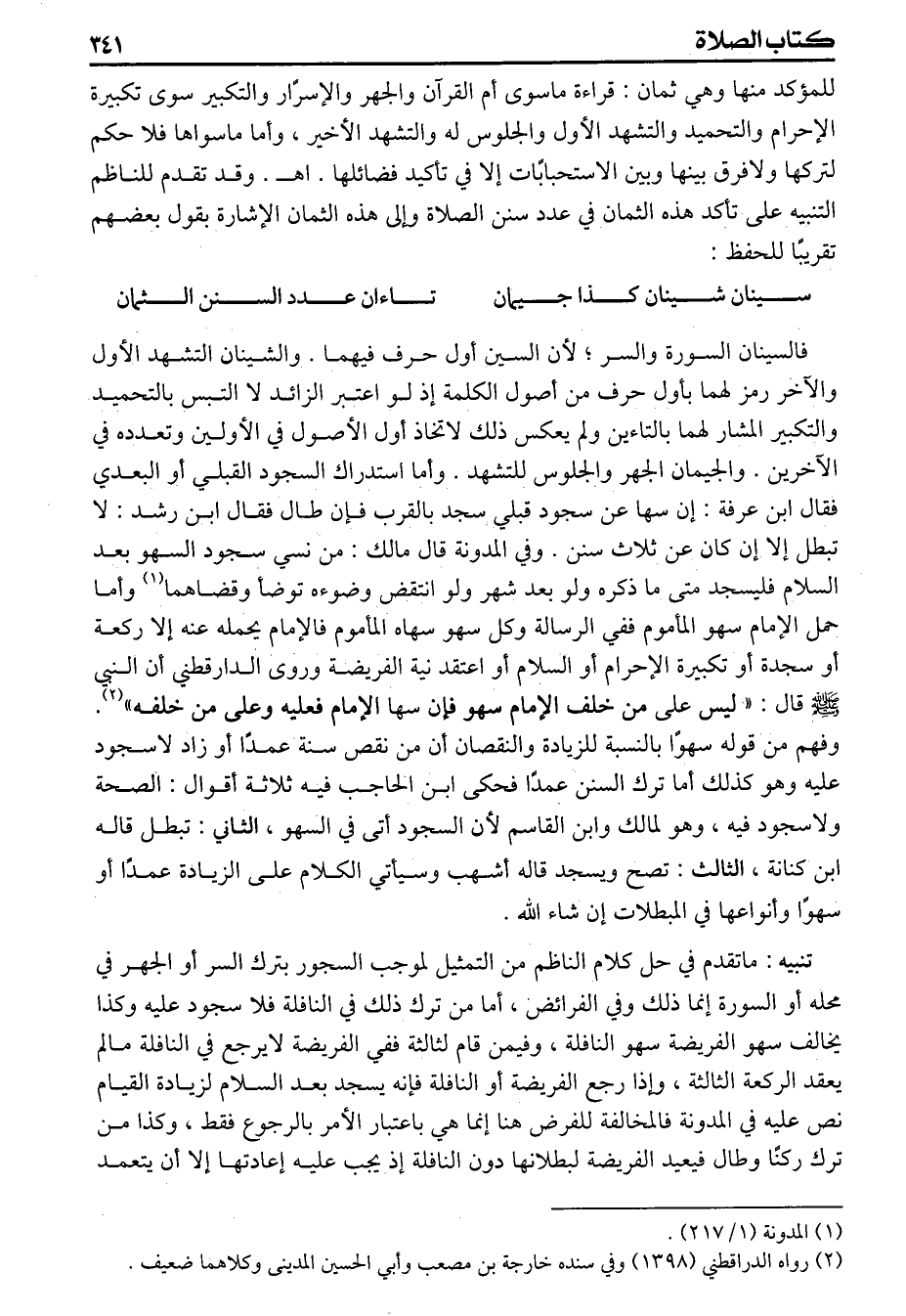 فالسينان السورة والسر لأن السين أول حرف فيهما والشينان التشهد الأول والأخر رمز لهما بأول حرف من أصول الكلمة إذ لو اعتير الزائد لا التبس بالتحميد والتكبير المشار لهما بالتاءين ولم يعكس ذلك لاتخاذ أول الأصول في الأولين وتعدده في الآخرين والجيمان الجهر والجلوس للتشهد وأما استدراك السجود القبلى أو البعدى فقال ابن عرفة إن سها عن سجود قبلى سجد بالقرب فإن طال فقال ابن رشد لاتبطل إلا إن كان عن ثلاث سنن وفي المدونة قال مالك من نسي سجود السهو بعد السلام فليسجد متى ماذكره ولو بعد شهر ولو انتقض وضوءه توضأ وقضاهما وأما حمل الإمام سهو المأموم ففي الرسالة وكل سهو سهاه المأموم فالإمام يحمله عنه إلا ركعة أو سجدة أو تكبيرة الإحرام او السلام أو اعتقد نية الفريضة وروى الدارقطني أن النبي «ليس على من خلف الإمام سهو فإن سها الإمام فعليه وعلى من خلفه» وفهم من قوله سهوا بالنسبة للزيادة والنقصان أن من نقص سنة عمدا أو زاد لاسجود عليه وهو كذلك أما ترك السنن عمدا فحكى ابن الحاجب فيه ثلاثة أقوال الصحة ولاسجود فيه وهو لمالك وابن القاسم لأن السجود أتى في السهو الثاني تبطل قاله ابن كنانة الثالث تصح ويسجد قاله أشهب وسيأتي الكلام على الزيادة عمدا أو سهوا وأنواعها في المبطلات إن شاء الله (تنبيه) ماتقدم في حل كلام الناظم من التمثيل لموجب السجور بترك السر أو الجهر في محله أو السورة إنما ذلك وفي الفرائض أما من ترك ذلك في النافلة فلا سجود عليه وكذا يخالف سهو الفريضة سهو النافلة وفيمن لثالثة ففي الفريضة لايرجع في النافلة مالم يعقد الركعة الثالثة وإذا رجع الفريضة أو النافلة فإنه يسجد بعد السلام لزيادة القيام نص عليه في المدونة فالمخالفة للفرض هنا إنما هي باعتبار الأمر بالرجوع فقط وكذا من ترك ركنا وطال فيعيد الفريضة لبطلانها دون النافلة إذ يجب عليه اعادتها إلا أن يتعمد