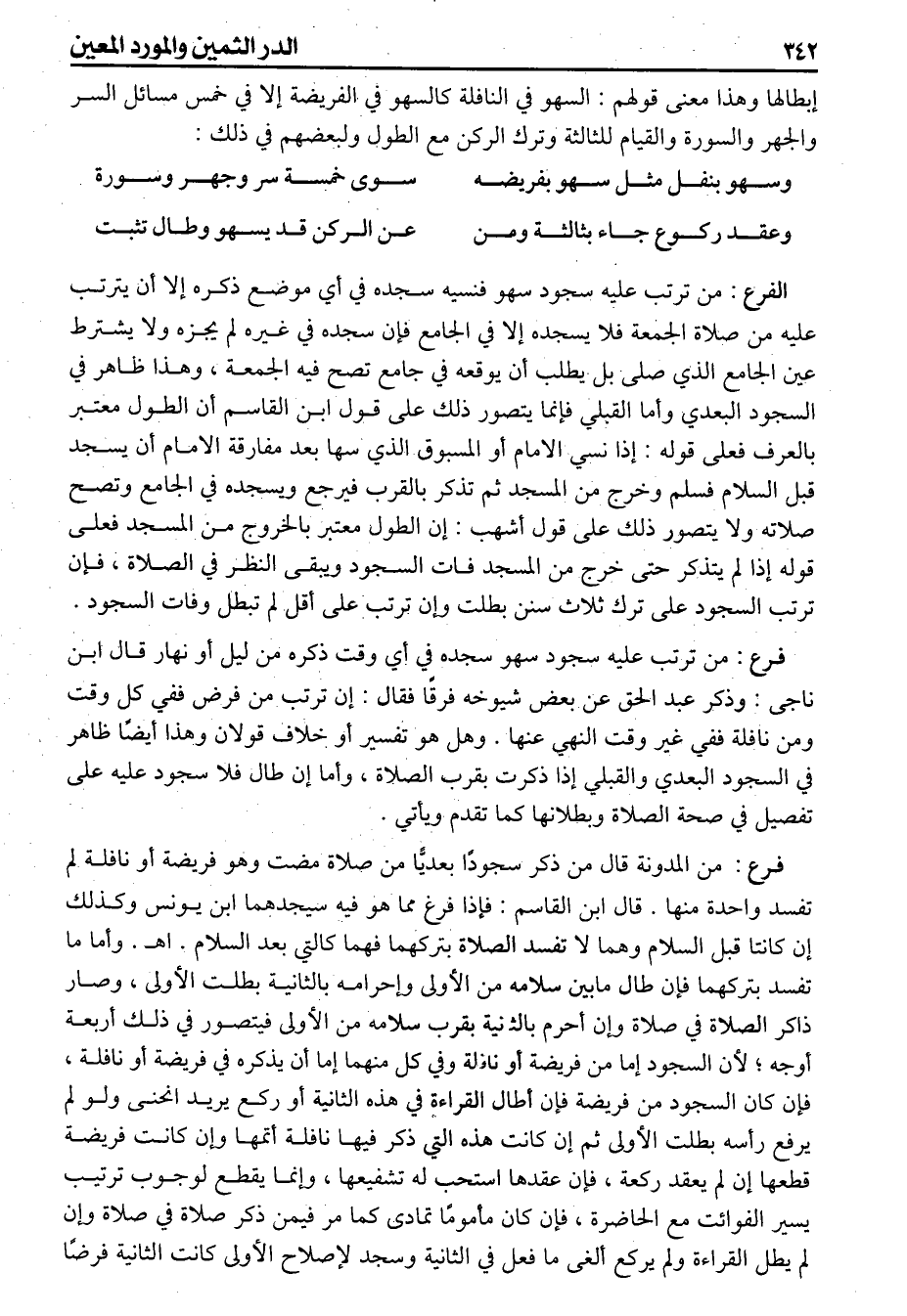 وسهو بنفل مثل سهو بفريضه. سوى خمسة سر وجهر وسورة. وعقد ركوع جا بثالثة ومن. عن الركن قد يسهو وطال تثبت (فرع) من ترتب عليه سجود سهو فنسيه سجده في أي موضع ذكره إلا أن يترتب عليه من صلاة الجمعة فلا يسجده إلا في الجامع فإن سجده في غيره لم يجزه ولايشترط عين الجامع الذي صلى بل يطلب أن يوقعه في جامع تصح فيه الجمعة وهذا ظاهر في السجود البعدي وأما القبلي فإنما يتصور ذلك على قول ابن القاسم أن الطول معتبر بالعرف فعلى قوله إذا نسي الامام أو المسبوق الذي سها بعد مفارقة الامام أن يسجد قبل السلام فسلم وخرج من المسجد ثم تذكر بالقرب فيرجع ويسجده في الجامع وتسمح صلاته ولايتصور ذلك على قول أشهب أن الطول معتبر بالخروج من المسجد فعلى قوله إذا لم يتذكر حتى خرج من المسجد فات السجود ويبقى النظر في الصلاة فإن ترتب السجود على ترك ثلاث سنن بطلت وإن ترتب على أقل لم تبطل وفات السجود (فرع) من ترتب عليه سجود سهو سجده في أي وقت ذكره من ليل أو نهار قال ابن ناجى وذكر عبد الحق عن بعض شيوخه فرقا فقال إن ترتب من فرض ففي كل وقت ومن نافلة ففي غير وقت النهي عنها وهل هو تفسير أو خلاف قولان وهذا أيضا ظاهر في السجود البعدى والقبلى إذا ذكرت بقرب الصلاة وأما إن طال فلا سجود عليه على تفصيل في صحة الصلاة وبطلانها كما تقدم ويأتي (فرع) من المدونة قال من ذكر سجودا بعديا من صلاة مضت وهو فريضة أو نافلة لم تفسد واحدة منها قال ابن القاسم فإذا فرغ مما هو فيه سيجدهما ابن يونس وكذلك إن كانتا قبل السلام وهما لاتفسد الصلاة بتركهما فهما كالتي بعد السلام اهـ وأما ماتفسد بتركهما فإن طال مابين سلامه من الأولى واحرامه بالثانية بطلت الأولى وصار ذاكر الصلاة في صلاة وإن أحرم بالثانية بقرب سلامه من الأولى فيتصور في ذلك أربعة أوجه لأن السجود إما من فريضة أو نافلة وفي كل منهما اما أن يذكره في فريضة أو نافلة فإن كان السجود من فريضة فإن أطال القراءة في هذه الثانية أو ركع يريد انحنى ولو لم يرفع رأسه بطلت الأول ثم إن كانت هذه التي ذكر فيها نافلة أتمها وإن كانت فريضة قطعها إن لم يعقد ركعة فإن عقدها استحب له تشفيعها وإنما يقطع لوجوب ترتيب يسير الفوائت مع الحاضرة فإن كان مأموما تمادى كما مر فيمن ذكر صلاة في صلاة وإن لم يطل القراءة ولم يركع الغى مافعل في الثانية وسجد لاصلاح الأولى كانت الثانية فرضا