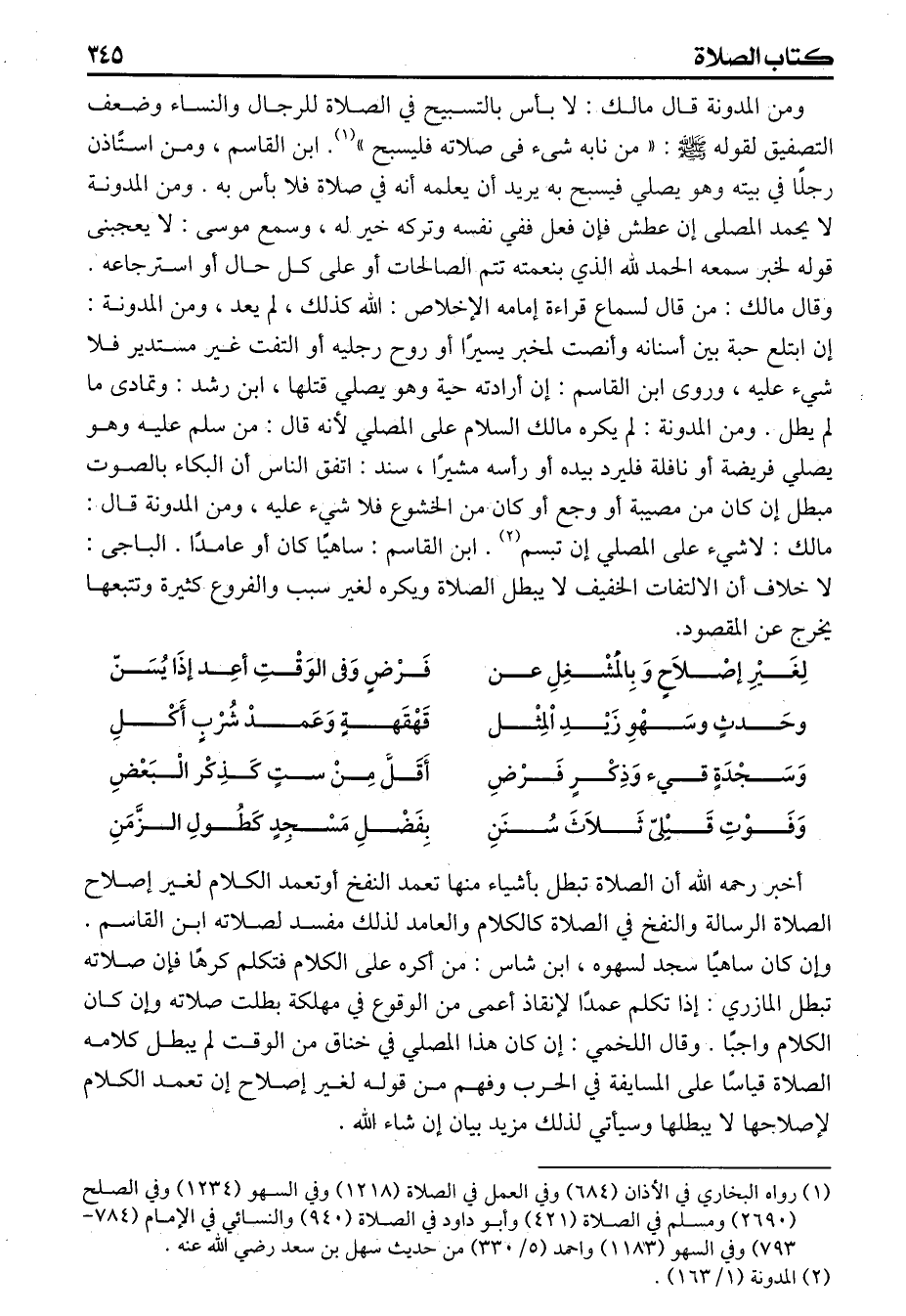 ومن المدونة قال مالك لابأس بالتسبيح في الصلاة للرجال والنساء وضعف التصفيق لقوله مننابه شىء فى صلاته فليسبح ابن القاسم ومن استأذن رجلا في بيته وهو يصلى فيسبح به يريد أن يعلمه أنه في صلاة فلا بأس به ومن المدونة لايحمد المصلى إن عطش فإن فعل ففي نفسه وتركه خير له وسمع موسى لايعجبنى قوله لخبر سمعه الحمد لله الذي بنعمته تتم الصالحات أو على كل حال أو استرجاعه وقال مالك من قال لسماع قراءة إمامه الاخلاص الله كذلك لم يعد ومن المدونة إن ابتلع حبة بين أسنانه وأنصت لمخبر يسيرا أو روح رجليه أو التفت غير مستدير فلا شيء عليه وروى ابن القاسم إن أرادته حية وهو يصلى قتلها ابن رشد وتمادى مالم يطل ومن المدونة لم يكره مالك السلام على المصلى لأنه قال من سلم عليه وهو يصلى فريضة أو نافلة فليرد بيده أو رأسه مشيرا سند اتفق الناس أن البكاء بالصوت مبطل إن كان من مصيبة أو رجع أو كان من الخشوع فلا شيء عليه ومن المدونة قال مالك لاشيء على المصلي إن تبسم ابن القاسم ساهيا كان أو عامدا الباجى لاخلاف أن الالتفات الخفيف لايبطل الصلاة ويكره لغير سبب والفروع كثيرة وتتبعها يخرج عن المقصود