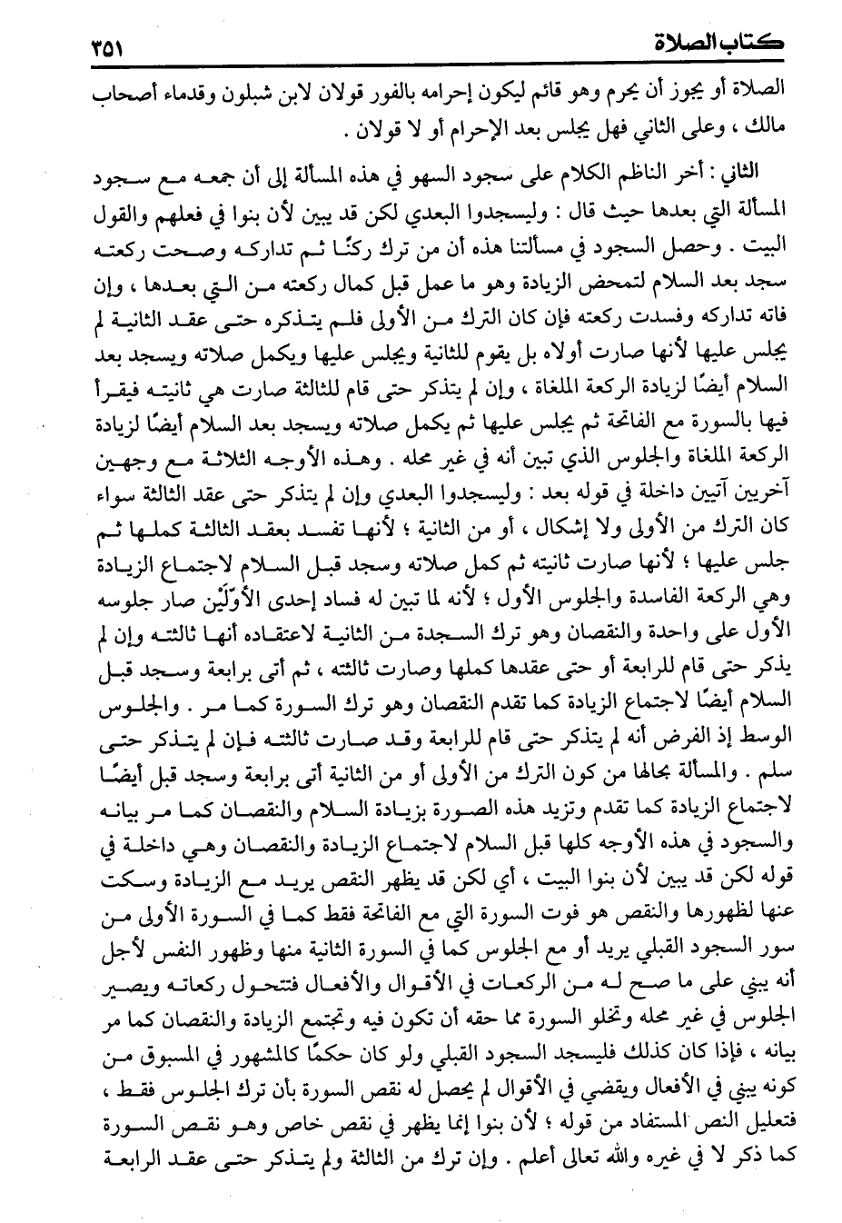 الصلاة أو يجوز أن يحرم وهو قائم ليكون إحرامه بالفور قولان لابن شبلون وقدماء أصحاب ومالك وعلى الثاني فهل يجلس بعد الإحرام أو لا قولان الثاني أخر الناظم الكلام على سجود السهو في هذه المسألة إلى أن جمعه مع سجود المسألة التي بعدها حيث قال وليسجدوا البعدى لكن قد يبين لأن بنوا في فعلهم والقول البيت وحصل السجود في مسألتنا هذه أن من ترك ركناً ثم تداركه وصحت ركعته سجد بعد السلام لتمحض الزيادة وهو ماعمل قبل كمال ركعته من التي بعدها وإن فاته تداركه وفسدت ركعته فإن كان الترك من الأولى فلم يتذكره حتى عقد الثانية لم يجلس عليها لأنها صارت أولاه بل يقوم للثانية ويجلس عليها ويكمل صلاته ويسجد بعد السلام أيضا لزيادة الركعة الملغاة وإن لم يتذكر حتى قام للثالثة صارت هي ثانيته فيقرأ فيها بالسورة مع الفاتحة ثم يجلس عليها ثم يكمل صلاته ويسجد بعد أيضا لزيادة الركعة الملغاة والجلوس الذي تبين أنه في غير محله وهذه الأوجه الثلاثة مع وجهين آخريين آتيين داخله في قوله بعد وليسجدوا البعدى وإن لم يتذكر حتى عقد الثالثة سواء كان الترك من الأولى ولا إشكال أو من الثانية لأنها تفسد بعقد الثالثة كملها ثم جلس عليها لأنها صارت ثانيته ثم كمل صلاته وسجد قبل السلام لاجتماع الزيادة وهي الركعة الفاسدة والجلوس الأول لأنه لما تبين له فساد إحدى الأوليين صار جلوسه الأول على واحدة والنقصان وهو ترك السجدة من الثانية لاعتقاده أنها ثالثته وإن لم يذكر حتى قام للرابعة أو حتى عقدها كملها وصارت ثالثته ثم أتى برابعة وسجد قبل السلام أيضا لاجتماع الزيادة كما تقدم النقصان وهو ترك السورة كما مر والجلوس الوسط إذالفرض أنه لم يتذكر حتى قام للرابعة وقد صارت ثالثته فإن لم يتذكر حتى سلم والمسألة بحالها من كون الترك من الأولى أو من الثانية أتى برابعة وسجد قبل أيضا لاجتماع الزيادة كما تقدم وتزيد هذه الصورة بزيادة السلام والنقصان كما مر بيانه والسجود في هذه الأوجه كلها قبل السلام لاجتماع الزيادة والنقصان وهي داخلة في قوله لكن قد يبين لأن بنوا البيت أي لكن قد يظهر النقص يريد مع الزيادة وسكت عنها لظهورها والنقص هو فوت السورة التي مع الفاتحة فقط كما في السورة الأولى من سور السجود القبلى يريد أو مع الجلوس كما في السورة الثانية منها وظهور النفس لأجل أنه يبني على ماصح له من الركعات في الأقوال والأفعال فتتحول ركعاته ويصير الجلوس في غير محله وتخلو السورة مما حقه أن تكون فيه وتجتمع الزيادة والنقصان كمامر بيانه فإذا كان كذلك فليسجد السجود القبلي ولو كان حكما كالمشهور في المسبوق من كونه يبني في الأفعال ويقضي في الأقوال لم يحصل له نقص السورة بأن ترك الجلوس فقط فتعليل النص المستفاد من قوله لأن بنوا إنما يظهر في نقص خاص وهو نقص السورة كما ذكر لا في غيره والله تعالى أعلم وإن ترك من الثالثة ولم يتذكر حتى عقد الرابعة