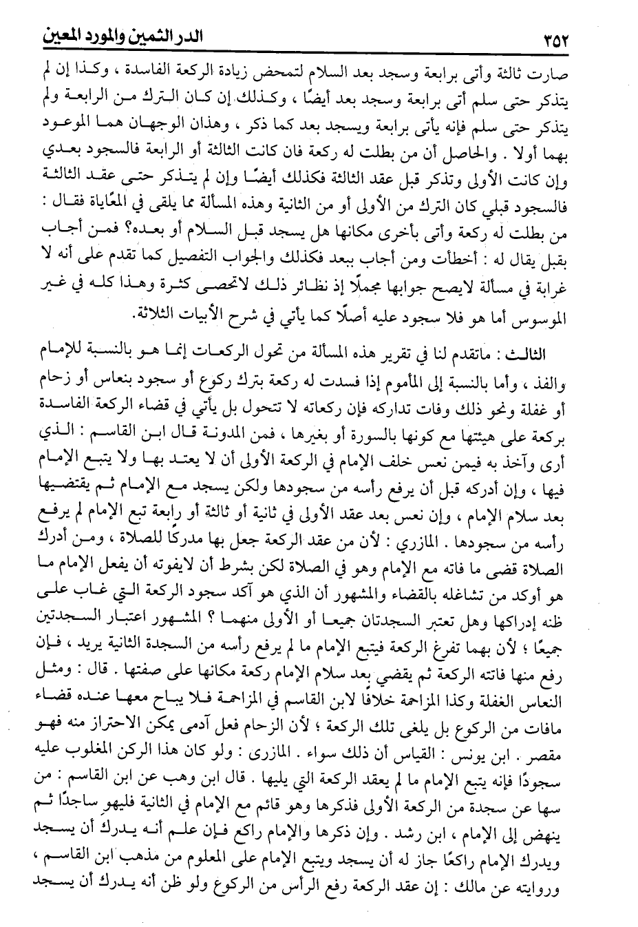 صارت ثالثة وأتى برابعة وسجد بعد السلام لتمحض زيادة الركعة الفاسدة وكذا إن لم يتذكر حتى سلم أتى برابعة وسجد بعد أيضا وكذلك إن كان الترك من الرابعة ولم يتذكر حتى سلم فإنه يأتى برابعة ويسجد بعد كما ذكر وهذان الوجهان هما الموعود بهما أولا والحاصل أن من بطلت له ركعة فان كانت الثالثة أو الرابعة فالسجود بعدي وأن كانت الأولى وتذكر قبل عقد الثالثة فكذلك أيضا وإن لم يتذكر حتى عقد الثالثة فالسجود قبلي كان الترك من الأولى أو من الثانية وهذه المسألة مما يلقى في المعاياة فقال من بطلت له ركعة وأتى بأخرى مكانها هل يسجد قبل السلام أو بعده فمن أجاب بقبل يقال له أخطأت ومن أجاب ببعد فكذلك والجواب التفصيل كما تقدم على أنه لا غرابة في مسألة لايصح جوابها مجملا إذ نظائر ذلك لاتحصى كثرة وهذا كله في غير الموسوس أما هو فلا سجود عليه أصلا كما يأتي في شرح الأبيات الثلاثة. الثالث ماتقدم لنا في تقرير هذه المسألة من تحول الركعات إنما هو بالنسبة للإمام والفذ وأما بالنسبة إلى المأموم إذا فسدت له ركعة بترك ركوع أو سجود بنعاس أو زحام أو غفلة ونحو ذلك وفات تداركه فإن ركعاته لاتتحول بل يأتي في قضاء الركعة الفاسدة بركعة على هيئتها مع كونها بالسورة أو بغيرها فمن المدونة قال ابن القاسم الذي أرى وآخذ به فيمن نعس خلف الإمام في الركعة الأولى أن لايعتد بها ولا يتبع الإمام فيها وإن أدركه قبل أن يرفع رأسه من سجودها ولكن يسجد مع الإمام ثم يقتضيها بعد سلام الإمام وإن نعس بعد عقد الأولى في ثانية أو ثالثة أو رابعة تبع الإمام لم يرفع رأسه من سجودها المازري لأن من عقد الركعة جعل بها مدركا للصلاة ومن أدرك الصلاة قضى مافاته مع الإمام وهو في الصلاة لكن بشرط أن لايفوته أن يفعل الإمام ماهو أوكد من تشاغله بالقضاء والمشهور أن الذي هو آكد سجود الركعة التي غاب على ظنه إدراكها وهل تعتبر السجدتان جميعا أو الأولى منهما المشهور اعتبار السجدتين جميعا لأن بهما تفرغ الركعة فيتبع الإمام مالم يرفع رأسه من السجدة الثانية يريد فإن رفع منها فاتته الركعة ثم يقضي بعد سلام الإمام ركعة مكانها على صفتها قال ومثل النعاس الغفلة وكذا المزاحمة خلافا لابن القاسم في المزاحمة فلا يباح معها عنده قضاء مافات من الركوع بل يلغى تلك الركعة لأن الزحام فعل آدمى يمكن الاحتراز منه فهو مقصر ابن يونس القياس أن ذلك سواء المازرى ولو كان هذا الركن المغلوب عليه سجودا فإنه يتبع الإمام مالم يعقد الركعة التي يليها قال ابن وهب عن ابن القاسم من سها عن سجدة من الركعة الأولى فذكرها وهو قائم مع الإمام في الثانية فليهو ساجدا ثم ينهض إلى الإمام ابن رشد وإن ذكرها والإمام راكع فإن علم أنه يدرك أن يسجد ويدرك الإمام راكعا جاز له أن يسجد ويتبع الإمام على المعلوم من مذهب ابن القاسم وروايته عن مالك إن عقد الركعة رفع الرأس من الركوع ولو ظن أنه يدرك أن يسجد