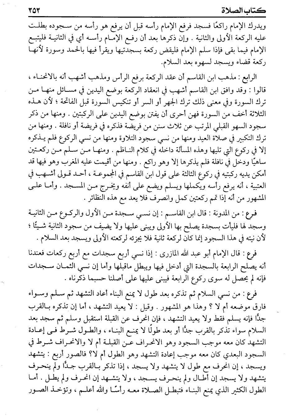 ويدرك الإمام راكعا فسجد فرفع الإمام رأسه قبل أن يرفع هو رأسه من سجوده بطلت عليه الركعة الأولى والثانية وإن ذكرها بعد أن رفع الإمام رأسه أي في والثانية فليتبع الإمام فيما بقى فإذا سلم الامام فليقض ركعة بسجدتيها ويقرأ فيها بالحمد وسورة لأنها ركعة قضاء ويسجد لسهوه بعد السلام. الرابع مذهب ابن القاسم أن عقد الركعة برفع الرأس ومذهب أشهب أنه بالانحناء قالوا وقد وافق ابن القاسم شهب في انعقاد الركعة بوضع اليدين في مسائل منها من ترك السورة وفي معنى ذلك ترك الجهر أوالسر أو تنكيس السورة قبل الفاتحة لأن هذه الثلاثة أخف من السورة فهن أحرى أن يفتن بوضع اليدين على الركبتين ومنها من ذكر سجود السهو القبلى المرتب عن ثلاث سنن من فريضة فذكره في فريضة أو نافلة ومنها من ترك التكبير في صلاة العيد ومنها من نسي سجود التلاوة ومنها من نسي الركوع فلم يذكره ألا في ركوع التي تليها وهذه المسألة داخله في كلام الناظم ومنها من سلم من ركعتين ساهيا ودخل في نافلة فلم يذكرها ألا وهو راكع ومنها من أقيمت عليه المغرب وهو فيها قد أمكن يديه ركبتيه في ركوع الثالثة على قول ابن القاسم في المجموعة أحد قولى أشهب في العتبية أنه يرفع رأسه ويكملها ويسلم ويضع على أنفه ويخرج من المسجد وأما على المشهور من أنه إذا تمم ركعتين كمل وانصرف فلا يعد مع هذه النظائر (فرع) من المدونة قال ابن القاسم إن نسي سجدة من الأول والركوع من الثانية وسجد لها فليأت بسجدة يصلح بها الأولى ويبنى عليها ولايضيف من سجود الثانية لأن نيته في هذا السجود إنما كان لركعة ثانية فلا يجزئه لركعته الأولى ويسجد بعد السلام (فرع) قال الإمام أبو عبد الله المازرى إذا نسي أربع سجدات مع أربع ركعات فعندنا أنه يصلح الرابعة بالسجدة التي أدخل فيها ويبطل ماقبلها وأما إن نسي الثمان سجدات فإنه لم يحصل له سوى ركوع الرابعة فيبنى عليها على أصلنا حسبما ذكرناه (فرع) من نسي السلام ثم تذكره بعد طول لايمنع البناء أعاد التشهد ثم سلم وسواء فارق موضعه أم لا وهذا هو المشهور وقيل لايعيد التشهد أما إن تذكره بالقرب جدا فانه يسلم فقط ولا يعيد التشهد فإن انحرف عن القبلة استقبل وسلم ثم سجد بعد السلام سواء تذكر بالقرب جدا أو بعد طول لايمنع البناء والطول شرط فى إعادة التشهد كان معه موجب السجود وهو الانحراف عن القبلة أو والانحراف شرط في السجود البعدي كان معه موجب إعادة التشهد وهو الطول أم لا فالصور أربع يتشهد ويسجد إن انحرف مع طول لايتشهد ولايسجد إذا تذكر بالقرب جدا ولم ينحرف يتشهد ولا يسجد إن أطال ولم ينحرف يسجد ولايتشهد إن انحرف ولم يطل أما الطول الكثير الذي يمنع البناء فتبطل الصلاة معه رأسا والله أعلم وتؤخذ الصور