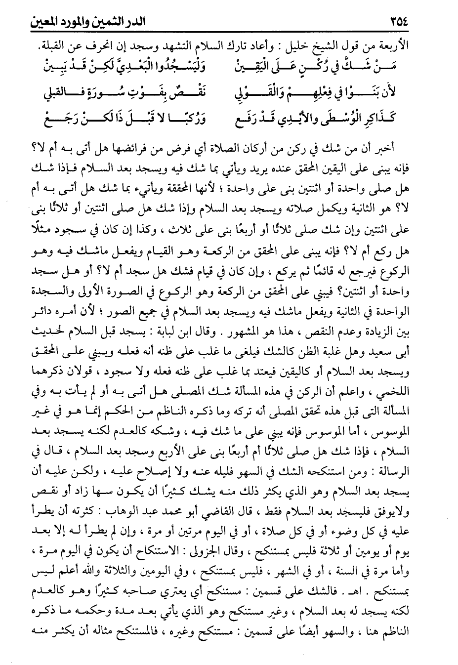 الأربعة من قول الشيخ خليل وأعاد تارك السلام التشهد وسجد ان انحرف عن القبلة