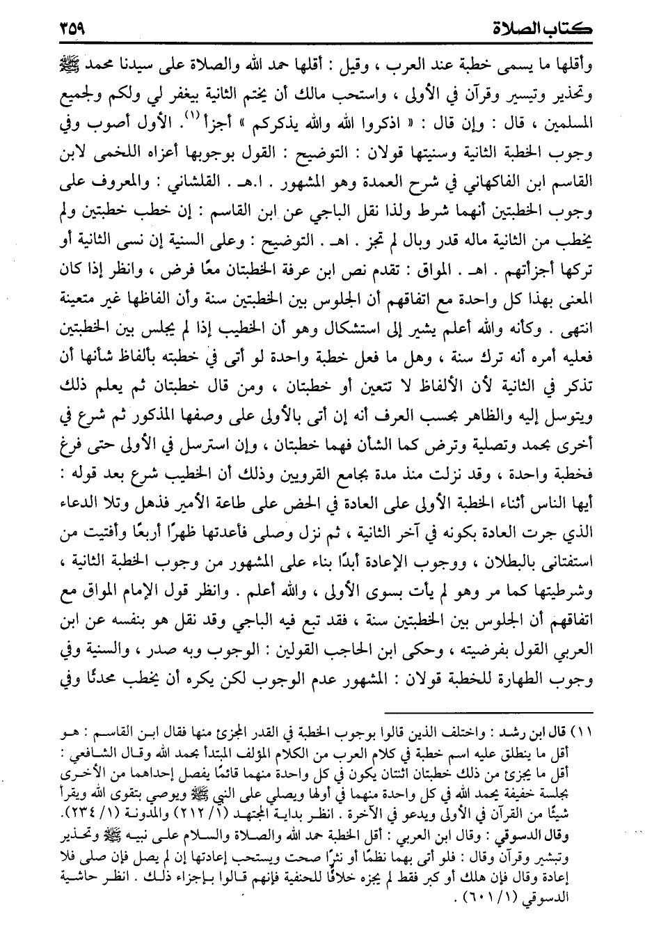 المواق تقدم نص ابن عرفة الخطبتان معا فرض وانظر إذا كان المعنى بهذا كل واحدة مع اتفاقهم أن الجلوس بين الخطبتين سنة وأن الفاظها غير متعينة انتهى