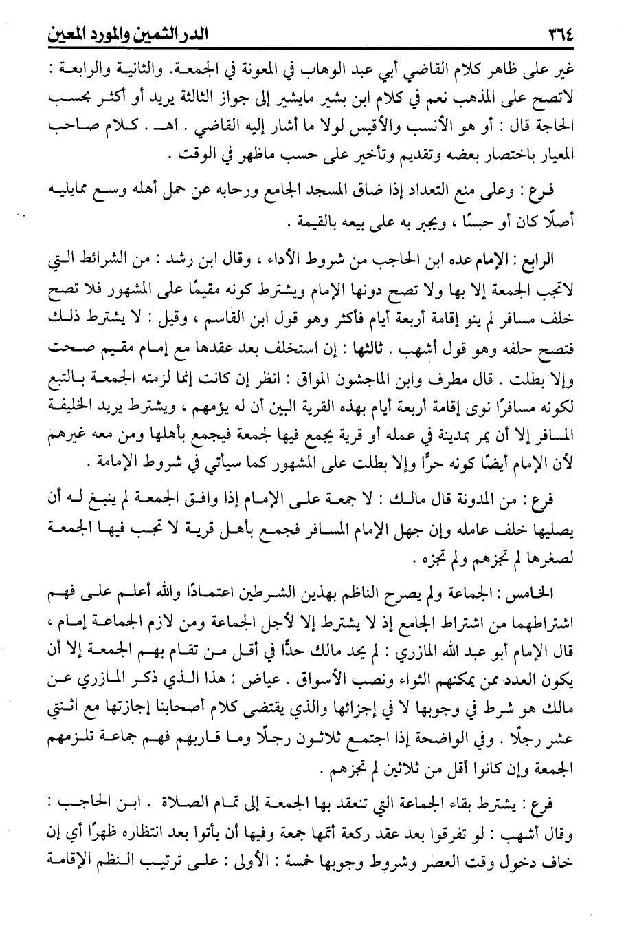 فرع: يشترط بقاء الجماعة التي تنعقد بها الجمعة إلى تمام الصلاة ابن الحاجب وقال أشهب لو تفرقوا بعد عقد ركعة أتمها جمعة وفيها أن يأتوا بعد انتظاره ظهرا أي إن خاف دخول وقت العصر وشروطه وجوبها خمسة. الأولى على ترتيب النظم الإقامة