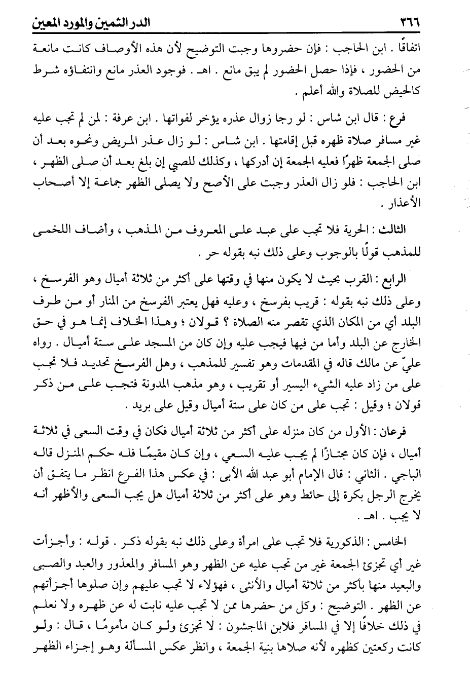 (فرع) قال ابن شاس لو رجا زوال عذره يؤخر لفواتها ابن عرفة لمن لم تجب عليه غير مسافر صلاة ظهره قبل إقامتها ابن شاس لو زال عذر المريض ونحوه بعد أن صلى الجمعة ظهراً فعليه الجمعة إن أدركها وكذلك للصبي إن بلغ بعد أن صلى الظهر ابن الحاجب فلو زال العذر وجبت على الأصح ولايصلى الظهر جماعة إلا أصحاب الاعذار. الثالث الحرية فلاتجب على عبد المعروف من المذهب وأضاف اللخمى للمذهب قولا بالوجوب وعلى ذلك نبه بقوله حر الرابع القرب بحيث لايكون منها في وقتها على أكثر من ثلاثة أميال وهو الفرسخ وعلى ذلك نبه بقوله قريب بفرسخ وعليه فهل يعتبر الفرسخ من المنار أو من طرف البلد أي من المكان الذي تقصر منه الصلاة قولان وهذا الخلاف إنما هو في حق الخارج عن البلد وأما من فيها فيجب عليه وإن كان من المسجد على ستة أميال رواه عن مالك قاله في المقدمات وهو تفسير للمذهب وهل الفرسخ تحديد فلا تجب على من زاد عليه الشيء اليسير أو تقريب وهو مذهب المدونة فتجب على من ذكر قولان وقيل تجب على من كان على ستة أميال وقيل على بريد