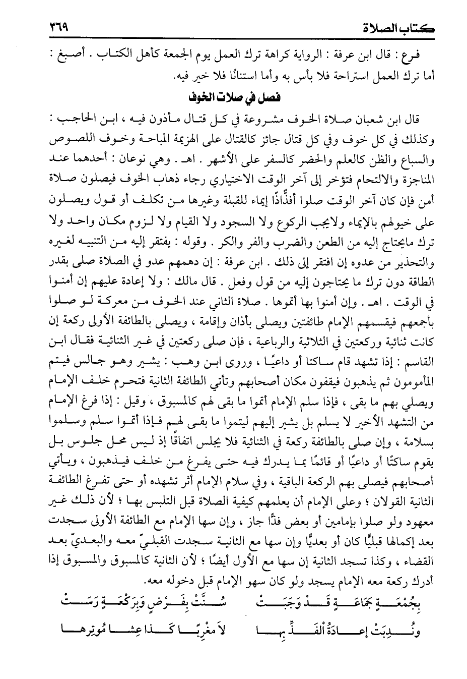 قال ابن شعبان صلاة الخوف مشروعة في كل قتال مأذون فيه ابن الحاجب وكذلك في كل خوف وفي كل قتال جائز كالقتال على الهزيمة المباحة وخوف اللصوص والسباع والظن كالعلم والحضر كالسفر على الأشهر اهـ وهي نوعان أحدهما عند المناجزة والالتحام فتؤخر إلى آخر الوقت الاختياري رجاء ذهاب الخوف فيصلون صلاة أمن فإن كان آخر الوقت صلوا أفذاذا إيماء للقبلة وغيرها من تكلف أو قول ويصلون على خيولهم بالإيماء ولايجب الركوع ولا السجود ولا القيام ولا لزوم مكان واحد ولا ترك مايحتاج إليه من الطعن والضرب والفر والكر وقول يفتقر إليه من التنبيه لغيره والتحذير من عدوه إن افتقر إلى ذلك ابن عرفة إن دهمهم عدو في الصلاة صلى بقدر الطاقة دون ترك مايحتاجون اليه من قول وفعل قال مالك ولا إعادة عليهم إن أمنوا في الوقت اهـ وإن أمنوا بها أتموها صلاة الثاني عند الخوف من معركة لو صلوا بأجمعهم فيقسمهم الامام طائفتين ويصلى بأذن وإقامة ويصلى بالطائفة الأولى ركعة إن كانت ثنائية وركعتين في الثلاثية والرباعية فإن صلى ركعتين في غير الثنائية فقال ابن القاسم إذا تشهد قام ساكتا أو داعيا وروى ابن وهب يشير وهو جالس فيتم المأمومون ثم يذهبون فيقفون مكان أصحابهم وتأتي الطائفة الثانية فتحرم خلف الإمام ويصلي بهم مابقى فإذا سلم الإمام أتموا مابقى لهم كالمسبوق وقيل إذا فرغ الامام من التشهد الأخير لايسلم بل يشير اليهم ليتموا مابقى لهم فإذا أتموا سلم وسلموا بسلامة وإن صلى بالطائفة ركعة في الثنائية فلا يجلس إتفاقا إذ لتس محل جلوس بل يقوم ساكتا أو داعيا أو قائما بما يدرك فيه حتى يفرغ من خلف فيذهبون ويأتي أصحابهم فيصلى بهم الركعة الباقية وفي سلام الامام أثر تشهده أو حتى تفرغ الطائفة الثانية القولان وعلى الامام أن يعلمهم كيفية الصلاة قبل التلبس بها لأن ذلك غير معهود ولو صلوا بإمامين أو بعض فذا جاز وإن سها الإمام مع الطائفة الأولى سجدت بعد إكمالها قبليا كان أو بعديا وإن سها مع الثانية سجدت القبلى معه والبعدى بعد القضاء وكذا تسجد الثانية إن سها مع الأول أيضا لأن الثانية كالمسبوق والمسبوق إذا أدرك ركعة معه الامام يسجد ولو كان سهو الامام قبل دخوله معه