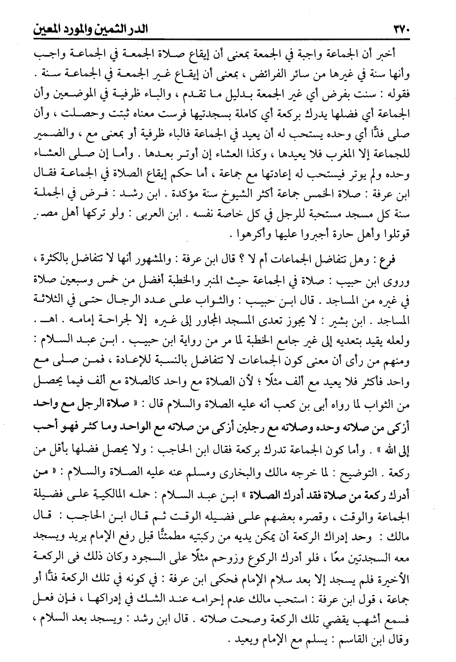 أخبر أن الجماعة واجبة في الجمعة بمعنى أن إيقاع صلاة الجمعة في الجماعة واجب وأنها سنة في غيرها من سائر الفرائض بمعنى أن إيقاع غير الجمعة في الجماعة سنة فقوله سنت بفرض أي غير الجمعة بدليل ماتقدم والباء ظرفية في الموضعين وأن الجماعة أي فضلها يدرك بركعة أي كاملة بسجدتيها فرست معناه ثبتت وحصلت وأن صلى فذا أي وحده يستحب له أن يعيد في الجماعة فالباء ظريفة أو بمعنى مع والضمير للجماعة إلا المغرب فلا يعيدها وكذا العشاء إن أوتر بعدها وأما إن صلى العشاء وحده ولم يوتر فيستحب له إعادتها مع جماعة أما حكم ايقاع الصلاة في الجماعة فقال ابن عرفة صلاة الخمس جماعة أكثر الشيوخ سنة مؤكدة ابن رشد فرض في الجملة سنة كل مسجد مستحبة للرجل في كل خاصة نفسه ابن العربى ولو تركها أهل مصر قوتلوا وأهل حارة أجبروا عليهاوأكرهوا (فرع) وهل تتفاضل الجماعات أم لاقال ابن عرفة والمشهور أنها لاتتفاضل بالكثرة وروى ابن حبيب صلاة في الجماعة حيث المنبر والخطبة أفضل من خمس وسبعين صلاة في غيره من المساجد قال ابن حبيب والثواب على عدد الرجل حتى في الثلاثة المساجد ابن بشير لايجوز تعدى المسجد المجاور إلى غيره أمامه اهـ إلا لجراحة امامه اهـ ولعله يقيد بتعديه إلى غير جامع لما مر من رواية ابن حبيب ابن عبد السلام ومنهم من رأى أن معنى كون الجماعات لاتتفاضل بالنسبة للاعادة فمن صلى مع واحد فأكثر فلا يعيد مع ألف مثلا لأن الصلاة مع واحد كالصلاة مع ألف فيما يحصل من الثواب لما رواه أبى بن كعب أنه عليه الصلاة والسلام قال «صلاة الرجل مع واحد أزكى من صلاته وحده وصلاته مع رجلين أزكى من صلاته مع الواحد وما كثر فهو أحب إلى الله» وأما كون الجماعة تدرك بركعة فقال ابن الحاجب ولا يحصل فضلها بأقل من ركعة التوضيح لما خرجه مالك والبخارى ومسلم عنه عليه الصلاة والسلام من أدرك ركعة من صلاة فقد أدرك الصلاة ابن عبد السلام حمله المالكية على فضيلة الجماعة والوقت وقصره بعضهم على فضيله الوقت ثم قال ابن الحاجب قال مالك وحد ادراك الركعة أن يمكن يديه من ركبتيه مطمئنا قبل رفع الإمام يريد ويسجد معه السجدتين معاً فلو أدرك الركوع وزوحم مثلا على السجود وكان ذلك فى الركعة الأخيرة فلم يسجد إلا بعد سلام الإمام فحكى ابن عرفة في كونه في تلك الركعة فذا أو جماعة قول ابن عرفة استحب مالك عدم إحرامه عند الشك في إدراكها فإن فعل فسمع أشهب يقضي تلك الركعة وصحت صلاته قال ابن رشد ويسجد بعد السلام وقال ابن القاسم يسلم مع الإمام ويعيد