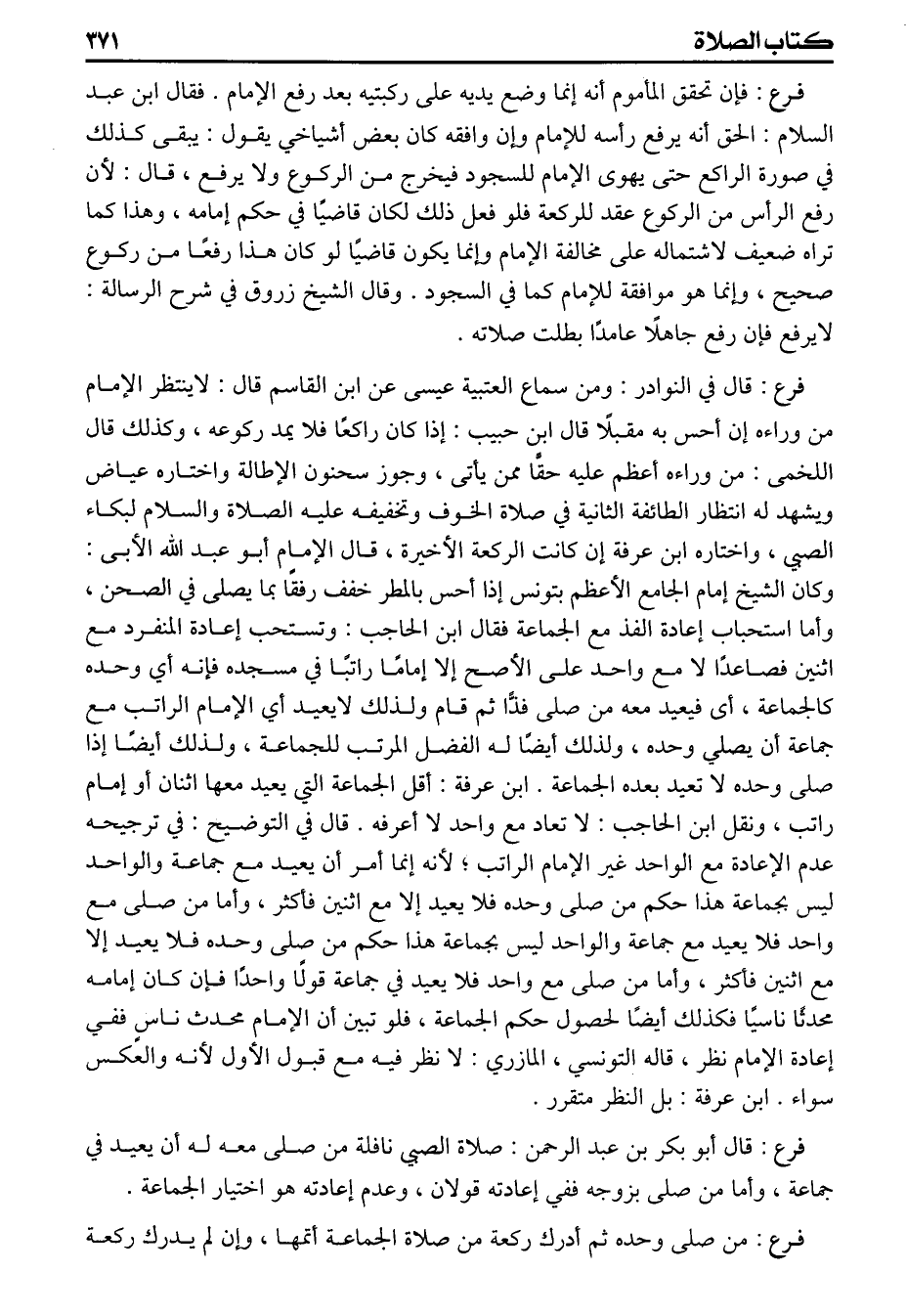 (فرع) فإن تحقق المأموم أنه إنما وضع يديه على ركبتيه بعد رفع الإمام فقال ابن عبد السلام الحق أنه يرفع رأسه للامام وإن وافقه كان بعض أشياخي يقول يبقى كذلك في صورة الراكع حتى يهوى الامام للسجود فيخرج من الركوع ولايرفع قال لأن رفع الرأس من الركوع عقد للركعة فلو فعل ذلك لكان قاضياً في حكم إمامه وهذا كما تراه ضعيف لاشتماله على مخالفة الامام وإنما يكون قاضياً لو كان هذا رفعا من ركوع صحيح وإنما هو موافقة للامام كما في السجود وقال الشيخ زروق في شرح الرسالة لايرفع فإن رفع جاهلا عامدا بطلت صلاته (فرع) قال في النوادر ومن سماع العتبية عيسى عن ابن القاسم قال لاينتظر الإمام من وراءه إن أحسن به مقبلا قال ابن حبيب إذا كان راكعا فلا يمد ركوعه وكذلك قال اللخمى من وراءه أعظم عليه حقا ممن يأتى وجوز سحنون الإطالة واختاره عياض ويشهد له انتظار الطائفة الثانية في صلاة الخوف وتخفيفه عليه الصلاة والسلام لبكاء الصبي واختاره ابن عرفة إن كانت الركعة الأخيرة قال الامام أبو عبد الله الأبى وكان الشيخ امام الجامع الأعظم بتونس إذا أحس بالمطر خفف رفقا بما يصلى في الصحن وأما استحباب إعادة الفذ مع الجماعة فقال ابن الحاجب وتستحب اعادة المنفرد مع إثنين فصاعدا لا مع واحد على الأصح إلا إماماً راتبا في مسجده فإنه أي وحده كالجماعة أى فيعيد معه من صلى بذا ثم قام ولذلك لايعيد أي الامامقولان وعدم إعادته هو اختيار جماعة (فرع) من صلى وحده ثم أدرك ركعة من صلاة الجماعة أتمها وإن لم يدرك ركعة
