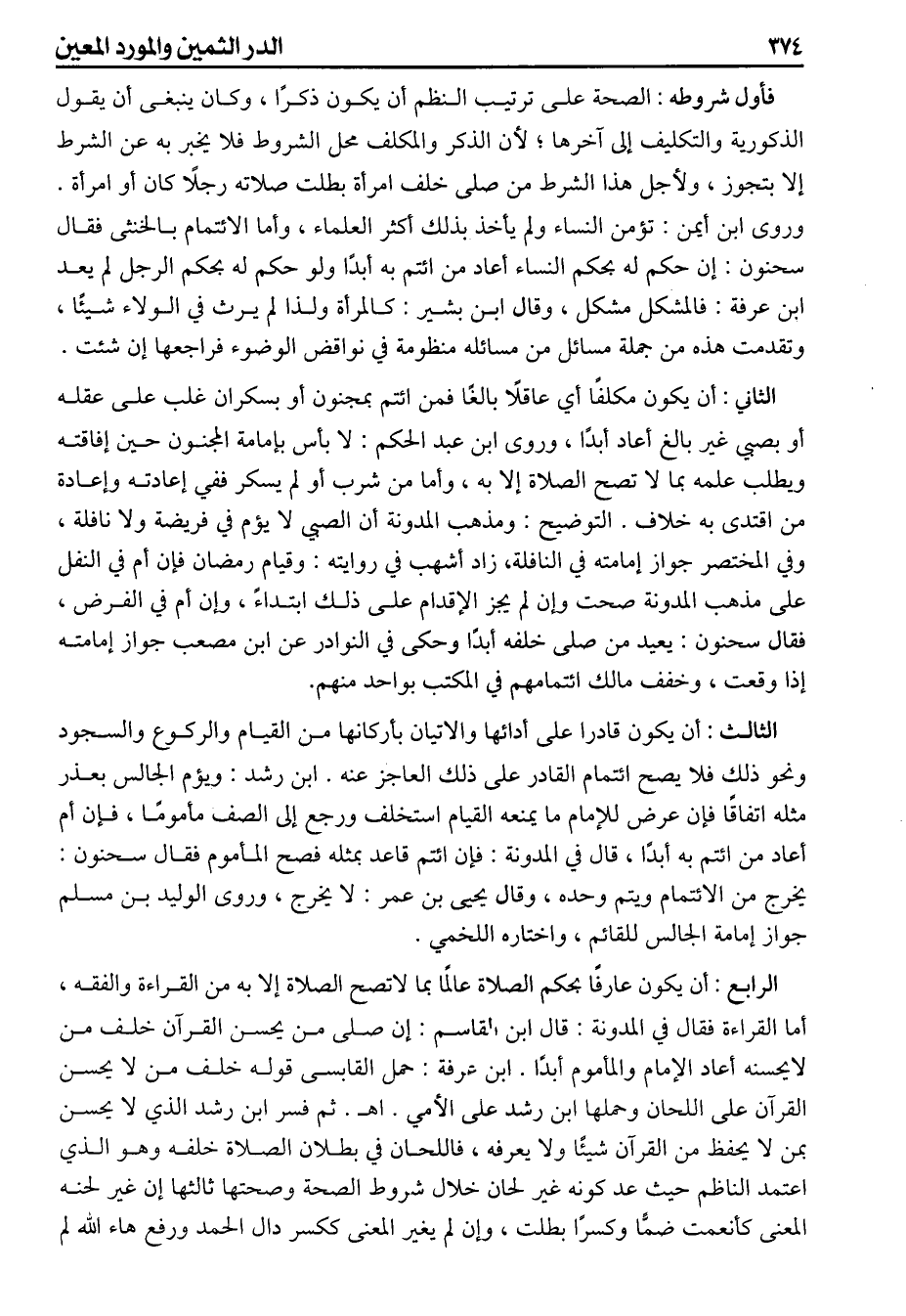 الثاني أن يكون مكلفا أي عاقلا بالغا فمن ائتم بمجنون أو بسكران غلب على عقله أو بصبى غير بالغ أعاد أبدا وروى ابن عبد الحكم لا بأس بامامة المجنون حين افاقته ويطلب علمه بما لاتصح الصلاة إلا به وأما من شرب أو لم يسكر ففي إعادته وإعادة من اقتدى به خلاف التوضيح ومذهب المدونة أن الصبي لا يؤم في فريضة ولانافلة وفي المختصر جواز أمامته في النافلة زاد أشهب في روايته وقيام رمضان فإن أم في النفل على مذهب المدونة صحت وإن لم يجز الاقدام على ذلك ابتداء وإن أم في الفرض فقال سحنون يعيد من صلى خلفه أبدا وحكى في النوادر عن ابن مصعب جواز إمامته وخفف مالك ائتمامهم في المكتب بواحد منهم. الثالث أن يكون قادرا على أدائها والاتيان بأركانها من القيام والركوع والسجود ونحو ذلك فلا يصح ائتمام القادر على ذلك العاجز عنه ابن رشد ويؤم الجالس بعذر مثله اتفاقا فإن عرض للامام مايمنعه القيام استخلف ورجع إلى الصف مأموما فإن أم أعاد من ائتم به أبدا قال في المدونة فإن ائتم قاعد بمثله فصح المأموم فقال سحنون يخرج من الائتمام ويتم وحده وقال يحيى بن عمر لايخرج وروى الوليد بن مسلم جواز إمامة الجالس للقائم واختاره اللخمى. الرابع أن يكون عارفا بحكم الصلاة عالما بما لاتصح الصلاة إلا به من القراءة والفقه أما القراءة فقال في المدونة قال ابن القاسم إن صلى من يحسن القرآن خلف من لايحسنه أعاد الإمام والمأموم أبدا ابن عرفة حمل القابسى قولها خلف من لايحسن القرآن على اللحان وحملها ابن رشد اهـ على الأمى ثم فسر ابن رشد الذي لايحسن بمن لايحفظ من القرآن شيئاً ولايعرفة فاللحان في بطلان الصلاة خلفه وهو الذي أعتمد الناظم حيث عد كونه غير لحان خلال شروط الصحة وصحتها ثالثها إن غير لحنه المعنى كأنعمت ضما وكسر ابطلت وإن لم يغير المعنى ككسر دال الحمد ورفع هاء الله لم