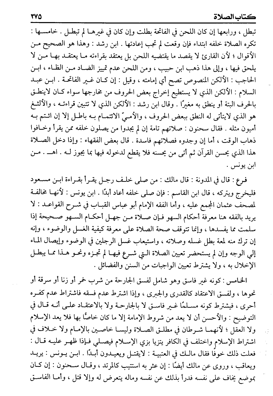 (فرع) قال في المدونة قال مالك من صلى خلف رجل يقرأ بقراءة ابن مسعود فليخرج ويتركه قال ابن القاسم فإن صلى خلفه أعاد أبداً ابن يونس لأنها مخالفة لمصحف عثمان المجمع عليه وأما الفقة الأمام أبو عباس القباب في شرح القواعد لايريد بالفقه هنا معرفة أحكام السهو فإن صلاة من جهل أحكام السهو صحيحة إذا سلمت مما يفسدها وإنما تتوقف صحة الصلاة على معرفة كيفية الغسل والوضوء وانه ان ترك منه لمعة بطل غسله وصلاته واستيعاب غسل الرجلين في الوضوء وإيصال الماء أي الوجه وإن لم يستحضر تعيين الصلاة التي شرع فيها لم تجزه ونحو هذا مما يبطل الاخلال به ولايشترط تعيين الواجبات من السنن والفضائل الخامس كونه غير فاسق وهو شامل لفسق الجارحة من شرب خمر أو زنا أو سرقة أو نحوها ولفسق الاعتقاد كالقدرى والجبرى واذا اشترط عدم فسقه فاشتراط عدم كفره أحرى فيشترط كونه مسلما غير فاسق لا بالجارحة ولا بالاعتقاد على أنه قال في التوضيح والأحسن أن لايعد من شروط الامامة إلا ماكان خاصاً بها فلا يعد الاسلام ولا العقل لأنهما شرطان في مطلق الصلاة وليسا خاصين بالامام ولا خلاف في اشتراط الاسلام واختلف في الكافر يتزيا بزى الاسلام فيصلى فإذا ظهر عليه قال فعلت ذلك خوفا فقال مالك في العتبية لايقتل ويعيدون أبداً ابن يونس يريد ويعاقب وروى عن مالك أيضا إن عثربه استتيب كالمرتد وقال سحنون إن كان بموضع يخاف على نفسه فدرأ بذلك عن نفسه وماله يتعرض له وإلا قتل وأما الفاسق