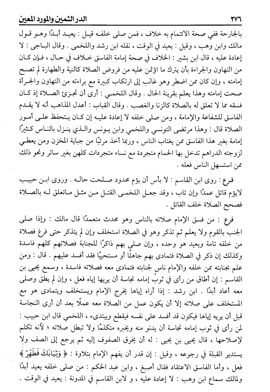 (فرع) من فسق الامام صلاته بالناس وهو محدث متعمداً قال مالك وإذا صلى الجنب بالقوم ولايعلم ثم تذكر وهو في الصلاة استحلف وإن لم يتذكر حتى فرغ فصلاة من خلفه تامة ويعيد هو وحده وإن صلى بهم ذاكرا للجناية فصلاتهم كلهم فاسدة وكذلك إن ذكر في الصلاة فتمادى بهم جاهلا أو مستحييا فقد أفسد عليهم قال ومن علم بجانبته ممن خلفه والامام ناس لجنابته فتمادى بهم جاهلا أو مستحييا فقد أفسد عليهم قال ومن بجانبته ممن خلفه والامام ناس لجنابته فتمادى معه فصلاته فاسدة وسمع يحيى بن القاسم إن أطاق من رأى في ثوب إمامه نجاسة أن يريها إياه فعل وإن لم يطق وصلى معه أعاد أبداً ابن رشد إذا أراه إياها يخرج الإمام ويستخلف ويتمادى هو مع المستخلف على صلاته إلا أن يكون عمل من الصلاة معه عملا بعد أن أرى النجاسة قبل أن يريه اياها فيكون قد أفسد على نفسه فيقطع ويبتدىء اللخمي قال ابن حبيب لمن رأى في ثوب إمامه نجاسة أن يدنو منه ويخبره متكلما ولاتبطل صلاته لأنه تكلم لإصلاحها قال يحيى بن يحيى له أن يخرق الصفوف إليه ثم يرجع إلى الصف ولا يستدير القبلة في رجوعه وقيل إن قدر أن يفهم الامام بتلاوة وثيابك فطهر فعل وأما الفاسق الاعتقاد فقال أصبغ وابن عبد الحكم من صلى خلفه يعيد أبدا ولمالك سماع ابن وهب لا اعادة عليه ولابن القاسم في المدونة يعيد في الوقت