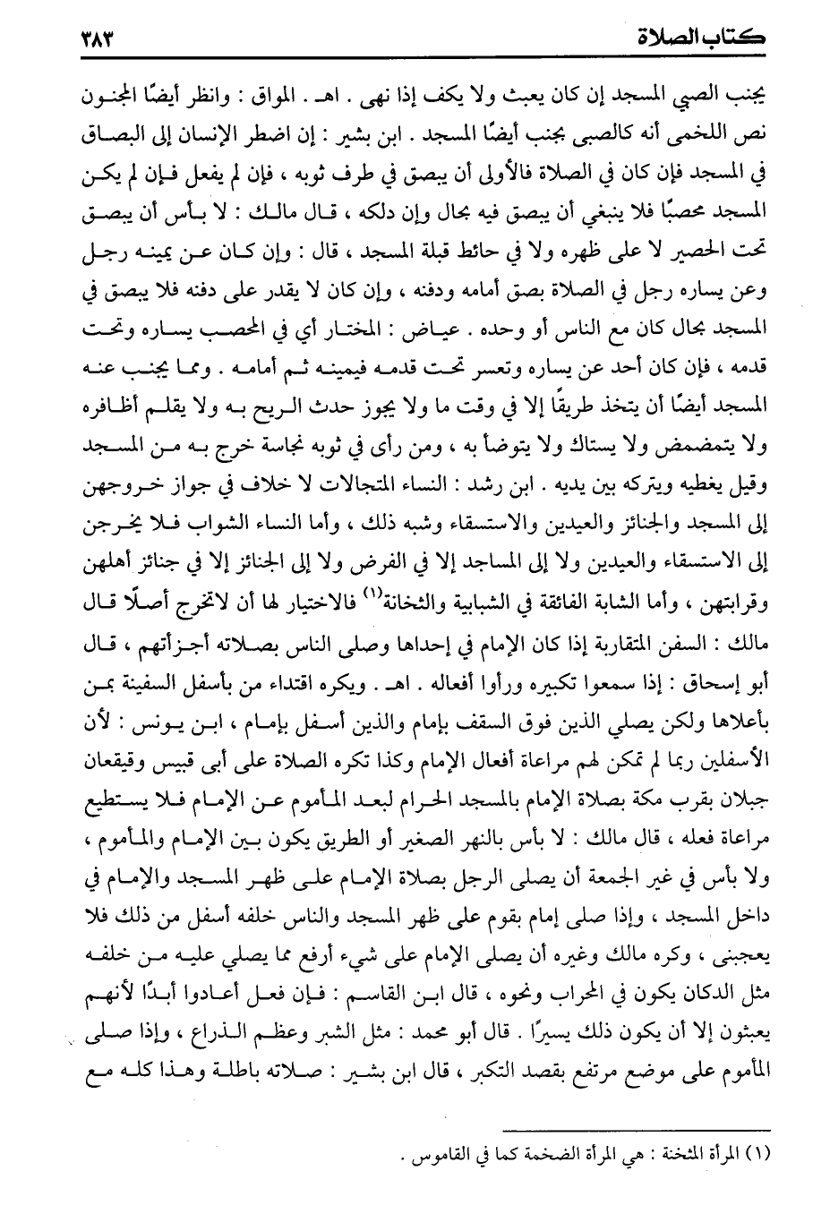 يجنب الصبي المسجد إن كان يعبث ولايكف إذا نهى اهـ المواق وانظر أيضا المجنون نص اللخمى أنه كالصبى بجنب أيضا المسجد ابن بشير إن اضطر الانسان إلى البصاق في المسجد فإن كان في الصلاة فالأولى أن يبصق في طرف ثوبه فإن لم يفعل لم يكن المسجد محصبا فلا ينبغي أن يبصق فيه بحال وإن دلكه قال مالك لابأس أن يبصق تحت الحصير لاعلى ظهره ولافي حائط قبلة المسجد قال وإن كان عن يمينه رجل وعن يساره رجل في الصلاة بصق أمامه ودفنه وإن كان لايقدر على دفنه فلا يبصق في المسجد بحال كان مع الناس أو وحده عياض المختار أي في المحصب يساره وتحت قدمه فإن كان أحد عن يساره وتعسر تحت قدمه فيمينه ثم أمامه ومما يجنب عنه المسجد أيضا أن يتخذ طريقا إلا في وقت ما ولايجوز حدث الريح به ولا يقلم أظافره ولا يتمضمض ولايستاك ولايتوضأ به ومن رأى في ثوبه نجاسة خرج به من المسجد وقيل يغطيه ويتركه بين يديه ابن رشد النساء المتجالات لاخلاف في جواز خروجهن إلى المسجد والجنائز والعيدين والاستسقاء وشبه ذلك وأما النساء الشواب فلا يخرجن إلى الاستسقاء والعيدين ولا إلى المساجد إلا في الفرض ولا إلى الجنائز إلا في جنائز أهلهن وقرابتهن وأما الشابة الفائقة في الشبابية والثخانة فالاختيار لها أن لاتخرج أصلا قال مالك السفن المتقاربة إذا كان الامام في إحداها وصلى الناس بصلاته أجزأتهم قال أبو اسحق إذا سمعوا تكبيرة ورأوا أفعاله اهـ ويكره اقتداء من بأسفل السفينة بمن بأعلاها ولكن يصلي الذين فوق السقف بامام والذين أسفل بامام ابن يونس لأن الأسفلين ربما لم تمكن لهم مراعاة أفعال الامام وكذا تكره الصلاة على أبى قبيس وقيقعان جبلان بقرب مكة بصلاة الامام بالمسجدالحرام لبعد المأموم عن الامام فلا يستطيع مراعاة فعله قال مالك لابأس بالنهر الصغير أو الطريق يكون بين الامام والمأموم ولا بأس في غير الجمعة أن يصلى الرجل بصلاة الامام على ظهر المسجد والامام في داخل المسجد وإذا صلى إمام بقوم على ظهر المسجد والناس خلفه أسفل من ذلك فلا يعجبنى وكره مالك وغيره أن يصلى الامام على شيء أرفع مما يصلى عليه من خلفه مثل الدكان يكون في المحراب ونحوه قال ابن القاسم فإن فعل أعادوا أبداً لأنهم يعبثون إلا أن يكون ذلك يسيراً قال أبو محمد مثل الشبر وعظم الذراع وإذا صلى المأموم على موضع مرتفع بقصد التكبر قال ابن بشير صلاته باطلة وهذا كله مع