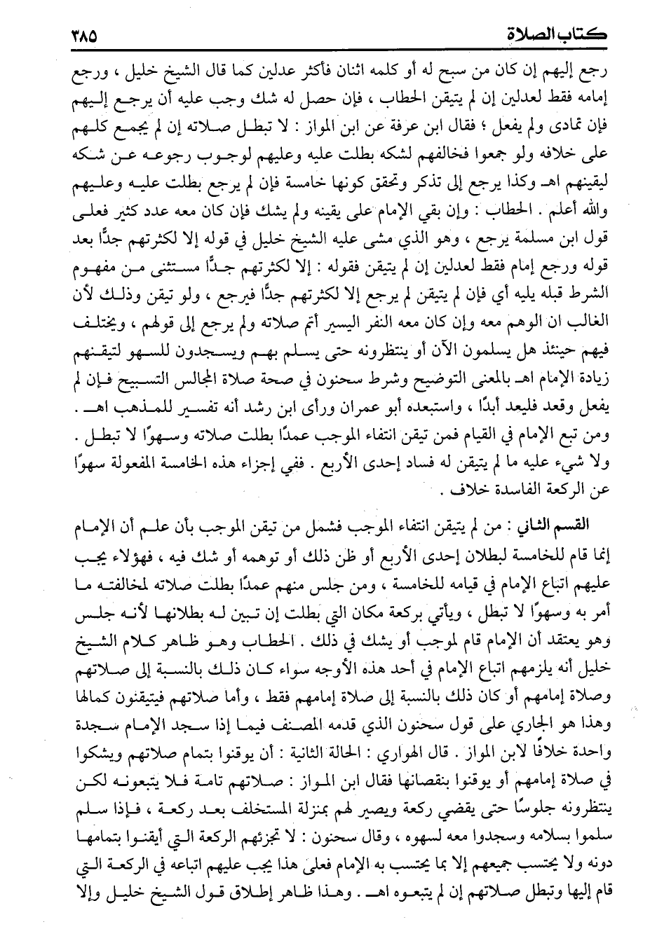 القسم الثاني: من لم يتيقن انتفاء الموجب فشمل من تيقن الموجب بأن علم أن الإمام إنما قام للخامسة لبطلان أحدى الأربع أو ظن ذلك أو توهمه أو شك فيه، فهؤلاء يجب عليهم اتباع الإمام في قيامه للخامسة، ومن جلس منهم عمداً بطلت صلاته لمخالفته ما أمر به وسهواً لا تبطل، ويأتي بركعة مكان التي بطلت إن تبين له بطلانها لأنه جلس وهو يعتقد أن الإمام قام لموجب أو يشك في ذلك. الحطاب وهو ظاهر كلام الشيخ خليل أنه يلزمهم اتباع الإمام في أحد هذه الأوجه سواء كان ذلك بالنسبة إلى صلاتهم وصلاة إمامهم أو كان ذلك بالنسبة إلى صلاة إمامهم فقط، وأما صلاتهم فيتيقنون كمالها وهذا هو الجاري على قول سحنون الذي قدمه المصنف فيما إذا سجد الإمام سجدة واحدة خلافاً لابن المواز. قال الهواري:
