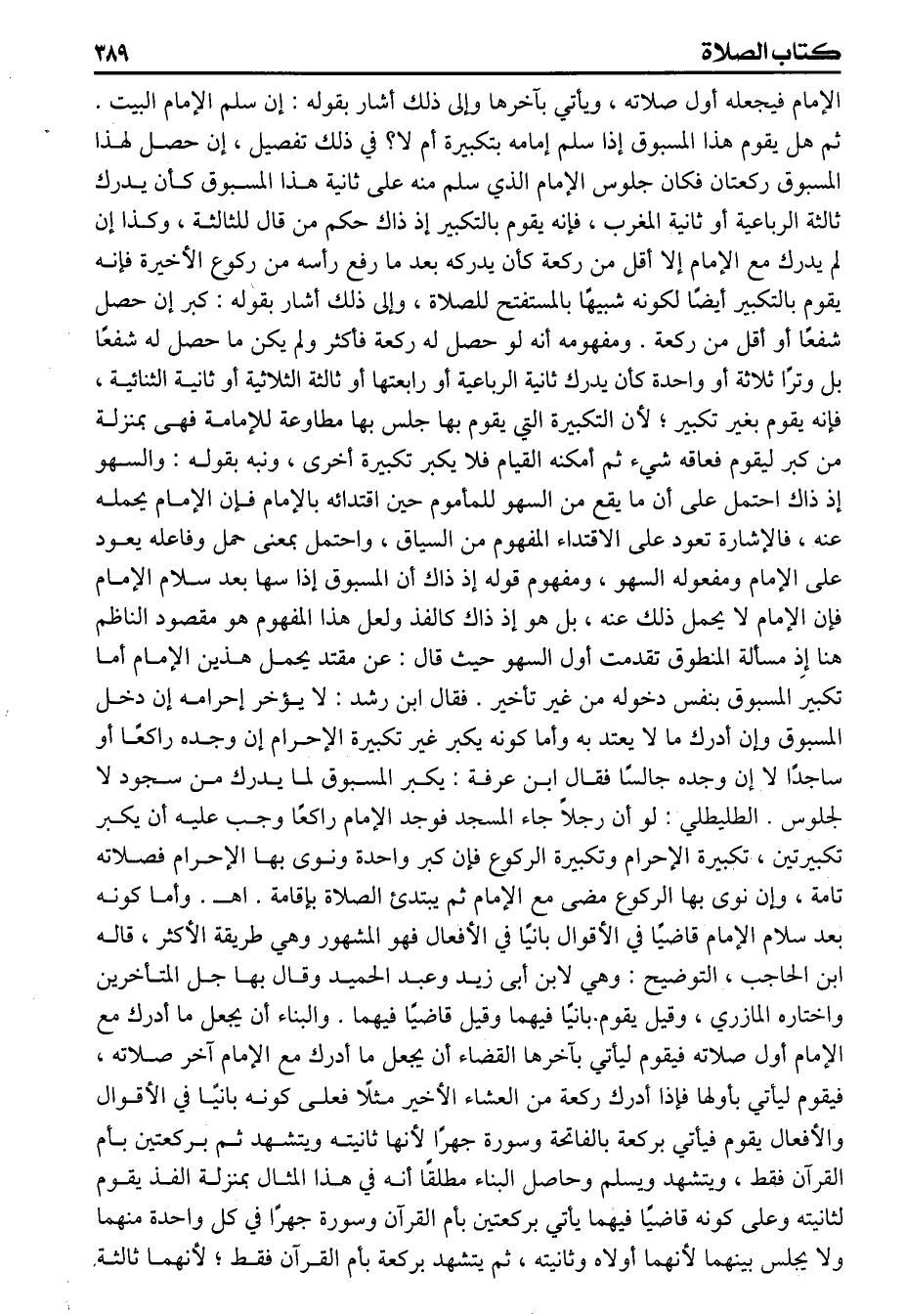 الإمام فيجعله أول صلاته ويأتي بآخرها وإلى ذلك أشار بقوله إن سلم الإمام البيت ثم هل يقوم هذا المسبوق إذا سلم إمامه بتكبيرة أم لا في ذلك تفصيل إن حصل لهذا المسبوق ركعتان فكان جلوس الامام الذي سلم منه على ثانية هذا المسبوق كأن يدرك ثالثة الرباعية أو ثانية المغرب فإنه يقوم بالتكبير إذ ذاك حكم من قال للثالثة وكذا إن لم يدرك مع الإمام إلا أقل من ركعة كأن يدركه بعد ما رفع رأسه من ركوع الأخيرة فإنه يقوم بالتكبير أيضا لكونه شبيها بالمستفتح للصلاة وإلى ذلك أشار بقوله كبر إن حصل شفعا أو أقل من ركعة ومفهومه أنه لو حصل له ركعة فأكثر ولم يكن ماحصل له شفعاً بل وترا ثلاثة أو واحدة كأن يدرك ثانية الرباعية أو رابعتها أو ثالثة الثلاثية أو ثانية الثنائية فإنه يقوم بغير تكبير لأن التكبير التي يقوم بها جلس بها مطاوعة للامامة فهى بمنزلة من كبر ليقوم فعاقه شيء ثم أمكنه القيام فلا يكبر تكبيرة أخرى ونبه بقوله والسهو إذ ذاك احتمل على أن ما يقع من السهو للمأموم حين اقتدائه بالإمام فإن الإمام يحمله عنه فالإشارة تعود على الاقتداء المفهوم من السياق واحتمل بمعنى حمل وفاعله يعود على الإمام ومفعوله السهو ومفهوم قوله إذ ذاك أن المسبوق إذا سها بعد سلام الإمام فإن الإمام لا يحمل ذلك عنه بل هو إذ ذاك كالفذ ولعل هذا المفهوم هو مقصود الناظم هنا مسألة المنطوق تقدمت أول السهو حيث قال عن مقتد هذين الامام أما تكبير المسبوق بنفس دخوله من غير تأخير فقال ابن رشد لايؤخر احرامه إن دخل المسبوق وإن أدرك مالا يعتد به وأما كونه يكبر غير تكبيرة الإحرام إن وجده راكعا أو ساجدا لا إن وجده جالسا فقال ابن عرفة يكبر المسبوق لما يدرك من سجود لا لجلوس الطليطلي لو أن رجلا جاء المسجد فوجد الإمام راكعا وجب عليه ان يكبر تكبيرتين تكبيرة الاحرام وتكبيرة الركوع فإن كبر واحدة ونوى بها الاحرام فصلاته تامة وإن نوى بها الركوع مضى مع الامام ثم يبتدىء الصلاة باقامة وأما كونه بعد سلام الامام قاضيا في الأقوال بانيا في الأفعال فهو المشهور وهي طريقة الأكثر قاله ابن الحاجب التوضيح وهي لابن أبى زيد وعبد الحميد وقال بها جل المتأخرين واختاره المازري وقيل يقوم بانيا فيهما وقيل قاضيا فيهما والبناء أن يجعل ماأدرك مع الإمام أول صلاته فيقوم ليأتي بآخرها القضاء أن يجعل ما أدرك مع الامام آخر صلاته فيقوم ليأتي بأولها فإذا أدرك ركعة من العشاء الأخير مثلا فعلى كونه بانيا في