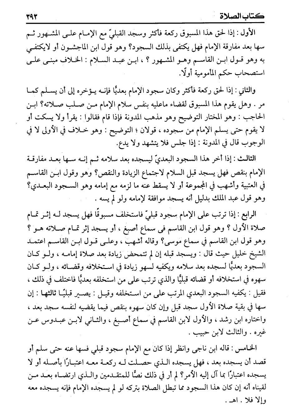 الرابع إذا ترتب على الإمام سجود قبلى فاستخلف مسبوقا فهل يسجد له اثر تمام صلاة الأول وهو قول ابن القاسم فى سماع أصبغ أو يسجد اثر تمام صلاته هو وهو قول ابن القاسم في سماع موسى وقاله أشهب وعلى قول ابن القاسم اعتمد الشيخ خليل حيث قال ويسجد قبله ان لم تتمحض زيادة بعد صلاة إمامه ولو كان السجود بعدياً لسجده بعد سلامه ويكفيه لسهو زيادة في استخلافه وقضائه ولو كان سهوه في استخلافه أو قضائه قبلياً والذي ترتب على من استخلفه بعدياً فاختلف في ذلك فقيل يكفيه السجود البعدي المرتب على من استخلفه وقيل يصير قبلياً ثالثها إن سها في بقية صلاة الأول سجد قبل وإن كان سهوه بنقص فيما يقضيه لنفسه سجد بعد واختاره ابن رشد والأول لابن القاسم في سماع أصبغ والثاني لابن عبدوس عن غيره والثالث لابن حبيب