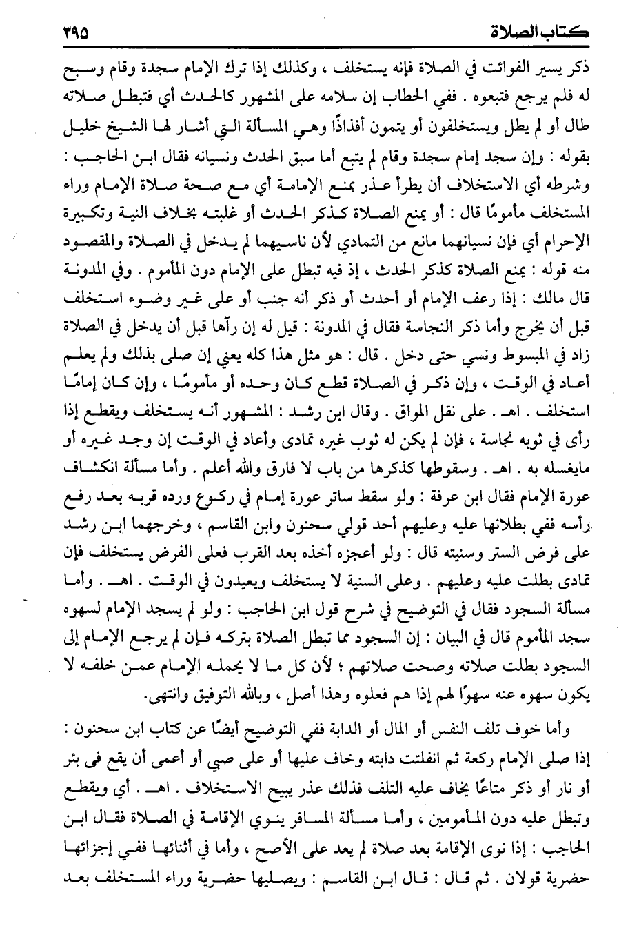ذكر يسير الفوائت في الصلاة فإنه يستخلف وكذلك إذا ترك الإمام سجدة وقام وسبح له فلم يرجع فتبعوه ففي الحطاب إن سلامه على المشهور كالحدث أي فتبطل صلاته طال أو لم يطل ويستخلفون أو يتمون أفذاذاً وهي المسألة التي أشار لها الشيخ خليل بقوله وإن سجد إمام سجدة وقام لم يتبع أما سبق الحدث ونسيانه فقال ابن الحاجب وشرطه أي الاستخلاف أن يطرأ عذر بمنع الإمامة أي مع صحة صلاة الامام وراء المستخلف مأموماً قال أو يمنع الصلاة كذكر الحدث أو غلبته بخلاف النية وتكبيرة الاحرام أي فإن نسيانهما مانع من التمادي لأن ناسيهما لم يدخل في الصلاة والمقصود منه قوله يمنع الصلاة كذكر الحدث إذ فيه تبطل على الإمام دون المأموم وفي المدونة قال مالك إذا رعف الامام أو أحدث أو ذكر أنه جنب أو على غير وضوء استخلف قبل أن يخرج وأما ذكر النجاسة فقال في المدونة قيل له إن رآها قبل أن يدخل في الصلاة زاد في المبسوط ونسي حتى دخل قال هو مثل هذا كله يعني إن صلى بذلك ولم يعلم أعاد في الوقت وإن ذكر في الصلاة قطع كان وحده أو مأموما وإن كان إماما استخلف اهـ على نقل المواق وقال ابن رشد المشهور أنه يستخلف ويقطع إذا رأى في ثوبه نجاسة فإن لم يكن له ثوب غيره تمادى وأعاد في الوقت إن وجد غيره أو مايغسله به اهـ وسقوطها كذكرها من باب لا فارق والله أعلم وأما مسألة انكشاف عورة الا ماله فقال ابن عرفة ولو سقط ساتر عورة إمام في ركوع ورده قربه بعد رفع رأسه ففي بطلانها عليه وعليهم أحد قولي سحنون وابن القاسم وخرجهما ابن رشد على فرض الستر وسنيته قال ولو أعجزه أخذه بعد القرب فعلى الفرض يستخلف فإن تمادى بطلت عليه وعليهم وعلى السنية لايستخلف ويعيدون في الوقت اهـ. وأما مسألة السجود فقال في التوضيح في شرح قول ابن الحاجب ولو لم يسجد الامام لسهوه سجد المأموم قال في البيان إن السجود مما تبطل الصلاة بتركه فإن لم يرجع الامام إلى السجود بطلت صلاته وصحت صلاتهم لأن كل ما لايحمله الامام عمن خلفه لايكون سهوه عنه سهوا لهم إذا هم فعلوه وهذا أصل وبالله التوفيق وانتهى