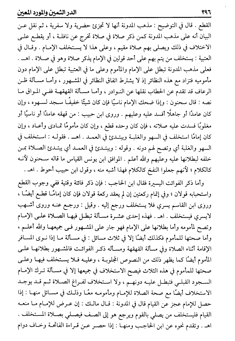 القطع قال في التوضيح مذهب المدونة أنها لاتجزىء حضرية ولاسفرية ثم نقل عن البيان أنه على مذهب المدونة كمن ذكر صلاة في صلاة تخرج عن نافلة أو يقطع على الاختلاف في ذلك ويصلى بهم صلاة مقيم وعلى هذا لايستخلف الإمام وقال في العتبية يستخلف من يتم بهم على أحد قولين في الإمام يذكر صلاة وهو في صلاة اهـ فعلى مذهب المدونة تبطل على الإمام والمأموم وعلى ما في العتبية تبطل على الإمام دون مأموميه فتزاد مع هذه النظائر إذ لايشترط اتفاق النظائر في المشهور وأما مسألة ظن الرعاف قد تقدم عن الحطاب نقلها عن النوادر وأما مسألة القهقهة ففي المواق مانصه قال سحنون وإذا ضحك الامام ناسيا فإن كان شيئا خفيفا سجد لسهوه وإن كان عامدا أو جاهلا أفسد عليه وعليهم وروى ابن حبيب من قهقه عامداً أو ناسياً أو مغلوبا فسدت عليه صلاته فإن كان وحده قطع وإن كان مأموما تمادى وأعاد وإن كان إماما استخلف في السهو والغلبة ويبتدىء في العمد اهـ فقوله استخلف في السهو والغلبة أي وتصح لهم دونه وقوله ويبتديء في العمد أي يبتديء الصلاة بمن خلفه لبطلانها عليه وعليهم والله أعلم الموافق ابن يونس القياس ماقاله سحنون لأنه كالكلام لأنهم جعلوا النفخ كالكلام فهذا أشبه منه وقول ابن حبيب أحوط اهـ