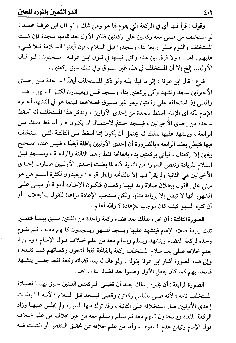 الصورة الرابعة أن يخبره بذلك بعد أن قضى الركعتين اللتين سبق بهما فصلاة المستخلف تامة لأنه صلى بالناس ركعتين وقضى فيسجد قبل السلام لأنه لما بطلت إحدى الأوليين صار استخلافه على الثانية وقد ترك منها السورة ولم يجلس عليها وزاد الركعة الملغاة ويسجدون كلهم معه ثم يسلم ويسلم معه من غير خلاف من علم خلاف قول الامام وتيقن عدم السقوط وأما من علم خلافه ممن تحقق النقص أو الشك فيه