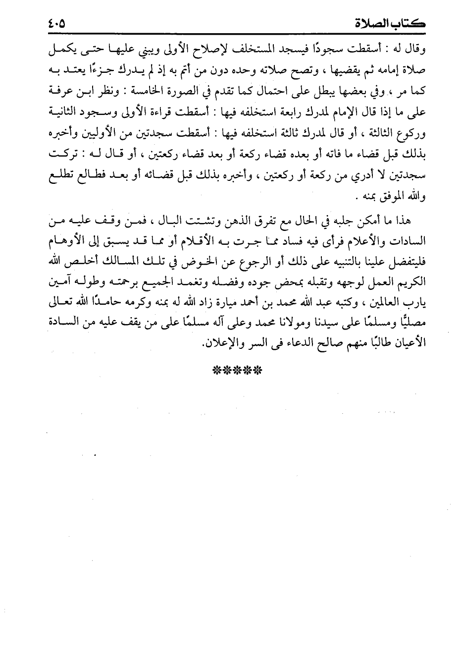 وقال له أسقطت سجودا فيسجد المستخلف لإصلاح الأولى ويبني عليها حتى يكمل صلاة إمامه ثم يقضيها وتصح صلاته وحده دون من أتم به إذ لم يدرك جزأ يعتد به كما مر وفي بعضها يبطل على احتمال كما تقدم في الصورة الخامسة ونظر ابن عرفة على مااذا قال الامام لمدرك رابعة استخلفه فيها أسقطت قراءة الأولى وسجود الثانية وركوع الثالثة أو قال لمدرك ثالثة استخلفه فيها أسقطت سجدتين من الأوليين وأخبره بذلك قبل قضاء مافاته أو بعده قضاء ركعة أو بعد قضاء ركعتين أو قال له تركت سجدتين لا أدري من ركعة أو ركعتين وأخبره بذلك قبل قضائه أو بعد فطالع تطلع والله الموفق بمنه هذا ما أمكن جلبه في الحال مع تفرق الذهن وتشتت البال فمن وقف عليه من السادات الاعلام فرأى فيه فساد مما جرت به الأفلام أو مما قد يسبق إلى الأوهام فليتفضل علينا بالتنبيه على ذك أو الرجوع عن الخوض في تلك المسالك أخلص الله الكريم العمل لوجهه وتقبله بمحض جوده وفضله وتغمد الجميع برحمته وطوله آمين يارب العالمين وكتبه عبد الله محمد بن أحمد ميارة زاد الله له بمنه وكرمه حامدا الله تعالى مصليا ومسلما على سيدنا ومولانا محمد وعلى آله مسلما على من يقف عليه من السادة الأعيان طالياً منهم صالح الدعاء فى السر والإعلان