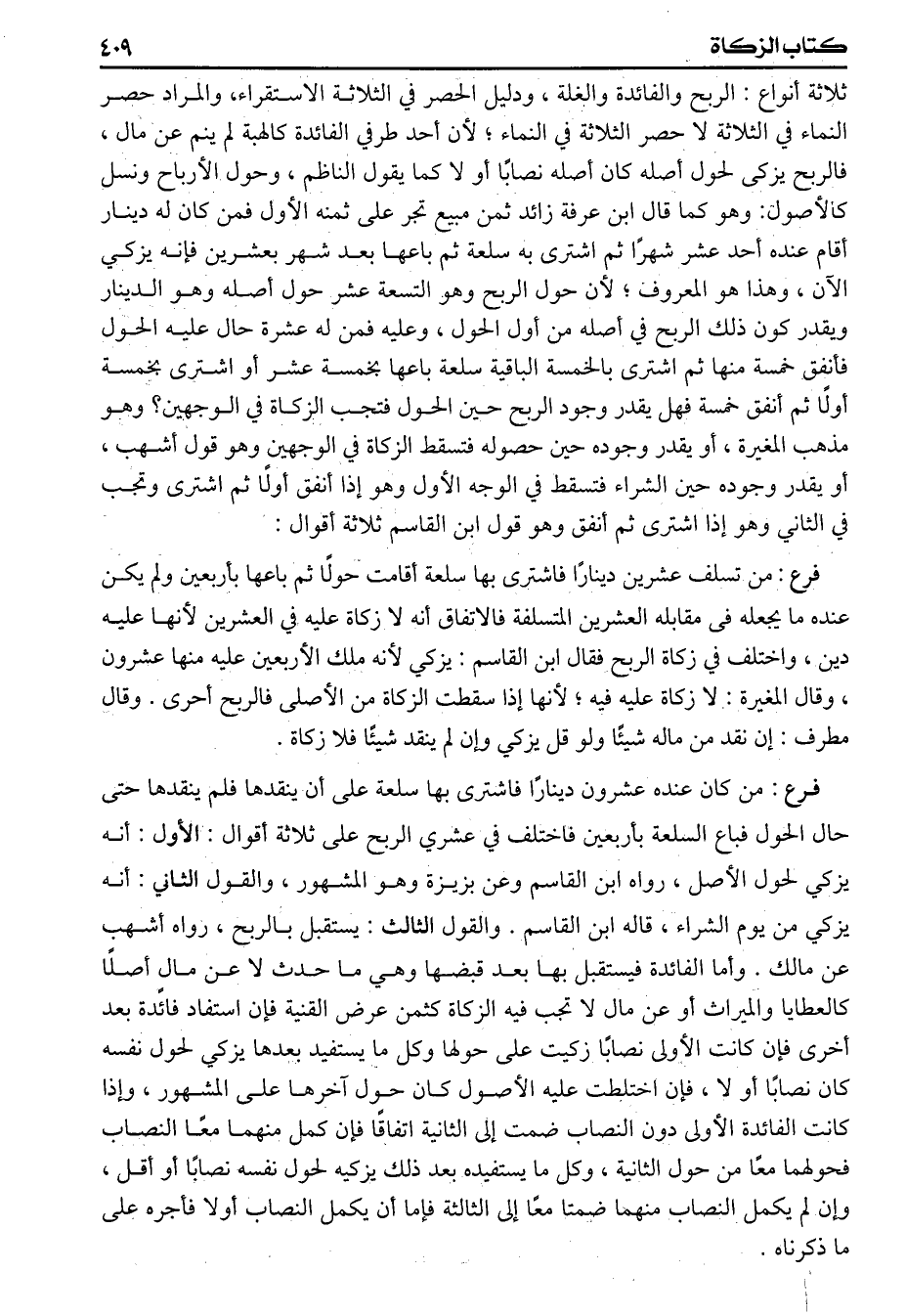 والقول الثاني أنه يزكي من يوم الشراء قاله ابن القاسم والقول الثالث يستقبل بالربح رواه أشهب عن مالك وأما الفائدة فيستقبل بها بعد قبضها وهي ماحدث لا عن مال أصلا كالعطايا والميراث أو عن مال لا تجب فيه الزكاة كثمن عرض القنية فإن استفاد فائدة بعد أخرى فإن كانت الأولى نصابا زكيت على حولها وكل مايستفيد بعدها يزكي لحول نفسه كان نصابا أو لا فإن اختلطت عليه الأصول كان حول آخرها على المشهور وإذا كانت الفائدة الأولى دون النصاب ضمت إلى الثانية اتفاقا فإن كمل منهما معا النصاب فحولهما معا من حول الثانية وكل مايستفيده بعد ذلك يزكيه لحول نفسه نصابا أو أقل وإن لم يكمل النصاب منهما ضمتا معا إلى الثالثة فإما أن يكمل النصاب أولا فأجره على ماذكرناه