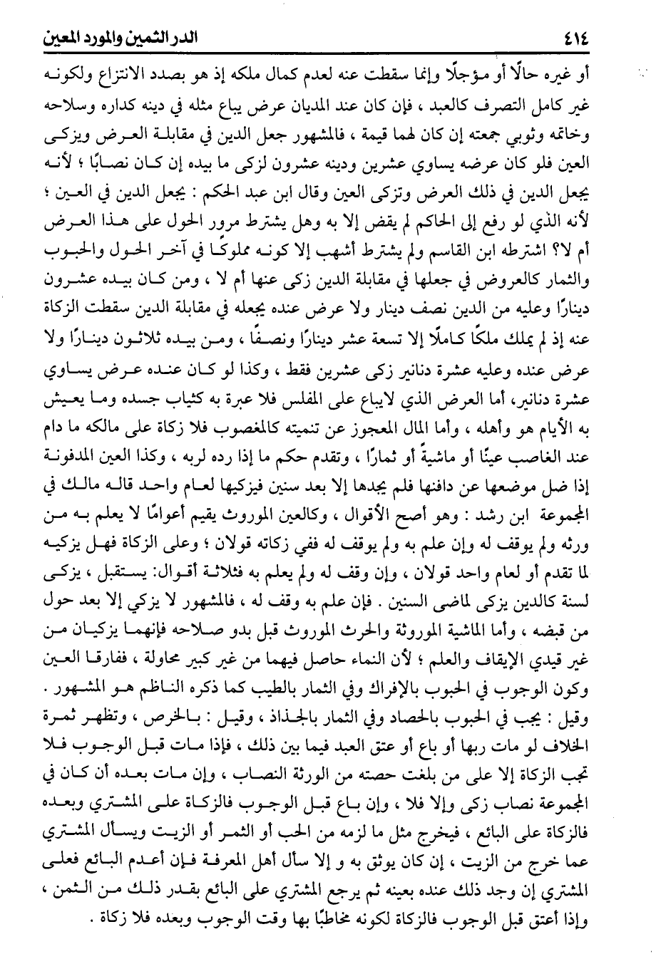 أو غيره حالا أو مؤجلا وإنما سقطت عنه لعدم كمال ملكه إذ هو بصدد الانتزاع ولكونه غير كامل التصرف كالعبد فإن كان عند المديان عرض يباع مثله في دينه كداره وسلاحه وخاتمه وثوبي جمعته إن كان لهما قيمة فالمشهور جعل الدين في مقابلة العروض ويزكى العين فلو كان عرضه يساوي عشرين ودينه عشرون لزكى مابيده ان كان نصابا لأنه يجعل الدين في ذلك العروض وتزكى العين وقال ابن عبد الحكيم يجعل الدين في العين لأنه الذي لو رفع إلى الحاكم لم يقض إلا به وهل يشترط مرور الحول على هذا العرض أم لا؟ لووعدم كمال ملكه من جهة أنه لايتصرف التصرف التام لا من جهة أن له انتزاع ماله إذ لايشمل المكاب ونحوه اشترطه ابن القاسم ولم يشترط أشهب إلا كونه مملوكا في آخر الحول والحبوب والثمار كالعروض في جعلها في مقابلة الدين زكى عنها أم لا ومن كان بيده عشرون ديناراً وعليه من الدين نصف دينار ولا عرض عنده يجعله في مقابلة الدين سقطت الزكاة عنه إذ لم يملك ملكا كاملا إلا تسعة عشر ديناراً ونصفاً، ومن بيده ثلاثون ديناراً ولا عرض عنده وعليه عشرة دنانير زكى عشرين فقط وكذا لو كان عنده عرض يساوي عشرة دنانير، أما العرض الذي لايباع على الفلس فلا عبرة به كثياب جسده وما يعيش به الأيام هو وأهله وأما المال المعجوز عن تنميته كالمغصوب فلا زكاة على مالكه ما دام عند الغاصب عينا أو ماشية أو ثماراً وتقدم حكم ما إذا رده لربه وكذا العين المدفونة إذا ضل موضعها عن دافنها فلم يجدها إلا بعد سنين فيزكيها لعام واحد قاله مالك في المجموعة ابن رشد وهو أصح الأقوال وكالعين الموروث يقيم أعواما لا يعلم به من ورثه ولم يوقف له وان علم به ولم يوقف له ففي زكاته قولان وعلى الزكاة فهل يزكيه لما تقدم أو لعام واحد قولان وان وقف له ولم يعلم به فثلاثة أقوال: يستقبل يزكى لسنة كالدين يزكى لماضى السنين فان علم به وقف له فالمشهور لا يزكي إلا بعد حول من قبضه وأما الماشية الموروثة والحرث الموروث قبل بدو صلاحه فإنهما يزكيان من غير قيدي الإيقاف والعلم لأن النماء حاصل فيهما من غير كبير محاولة ففارقا العين وكون الوجوب في الحبوب بالافراك وفي الثمار بالطيب كما ذكره الناظم هو المشهور وقيل يجب في الحبوب بالحصاد وفي الثمار بالجذاذ وقيل بالخرص وتظهر ثمرة الخلاف لو مات ربها أو باع أو عتق العبد فيما بين ذلك فاذا مات قبل الوجوب فلا تجب الزكاة إلا على من بلغت حصته من الورثة النصاب وان مات بعده أن كان في المجموعة نصاب زكى وإلا فلا وإن باع قبل الوجوب فالزكاة على المشتري وبعده فالزكاة على البائع فيخرج مثل مالزمه من الحب أو الثمر أو الزيت ويسأل المشتري عما خرج من الزيت إن كان يوثق به وإلا سأل أهل المعرفة فإن أعدم البائع فعلى المشتري إن وجد ذلك عنده بعينه ثم يرجع المشتري على البائع بقدر ذلك من الثمن وإذا اعتق قبل الوجوب فالزكاة لكونه مخاطباً بها وقت الوجوب وبعده فلا زكاة