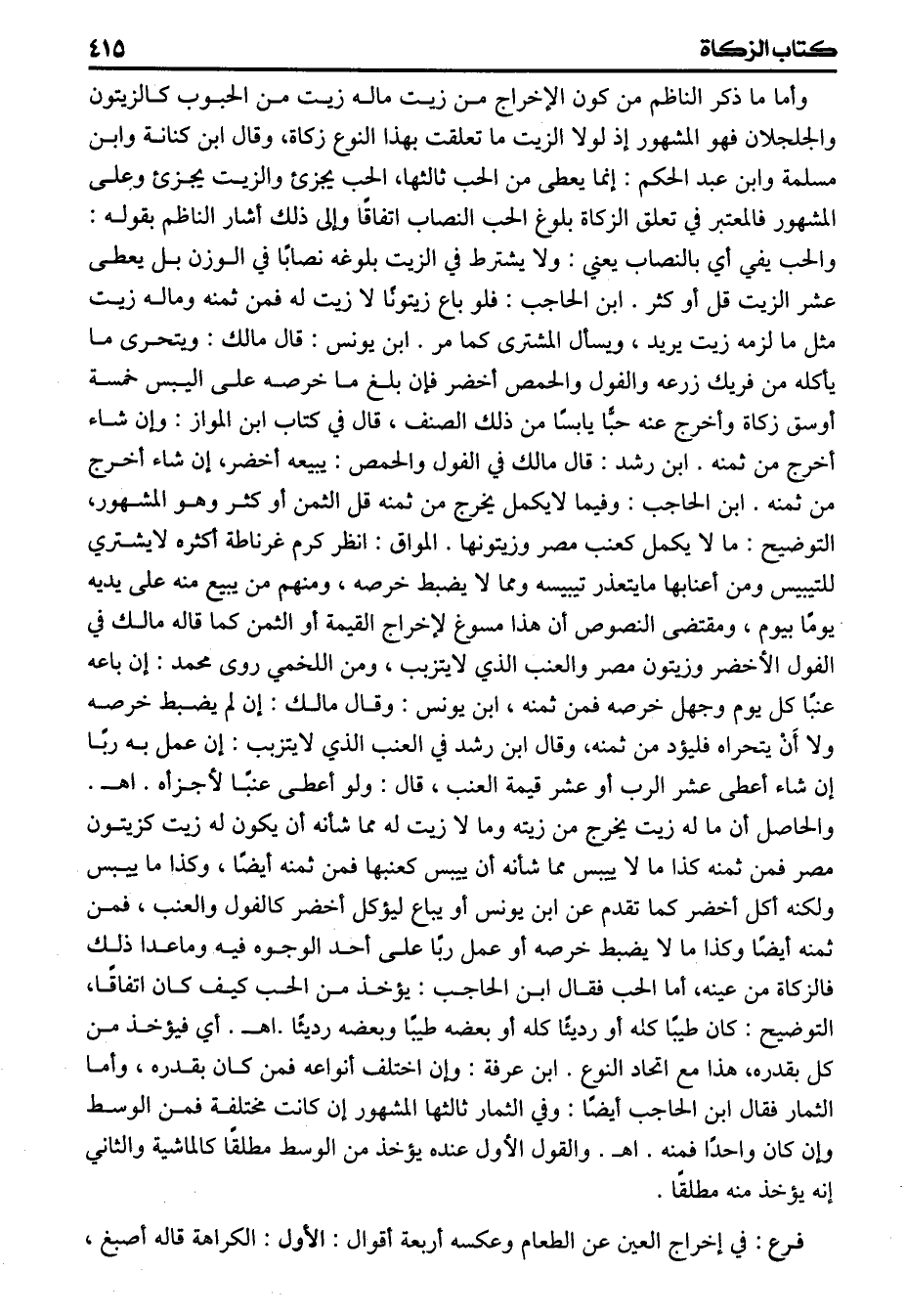 وأما ما ذكر الناظم من كون الإخراج من زيت ماله زيت من الحبوب كالزيتون والجلجلان فهو المشهور إذ لولا الزيت ماتعلقت بهذا النوع زكاة، وقال ابن كنانة وابن مسلمة وابن عبد الحكم إنما يعطى من الحب ثالثها، الحب يجزىء والزيت يجزىء وعلى المشهور فالمعتبر في تعلق الزكاة بلوغ الحب النصاب اتفاقا وإلى ذلك أشار الناظم بقوله والحب بفي أي بالنصاب يعني ولايشترط في الزيت بلوغه نصابا في الوزن بل يعطى عشر الزيت قل أو كثر ابن الحاجب فلو باع زيتونا لازيت له فمن ثمنه وماله زيت مثل مالزمه زيت يريد ويسأل المشترى كما مر ابن يونس قال مالك ويتحرى مايأكله من فريك زرعه والفول والحمص أخضر فإن بلغ ماخرصه على اليبس خمسة أوسق زكاة وأخرج عنه حبا يابساً من ذلك الصنف قال في كتاب ابن المواز وإن شاء أخرج من ثمنه ابن رشد قال مالك في الفول والحمص يبيعه أخضر، لووعدم كمال ملكه من جهة أنه لايتصرف التصرف التام لا من جهة أن له انتزاع ماله إذ لايشمل المكاب ونحوه إن شاء أخرج من ثمنه ابن الحاجب وفيما لايكمل يخرج من ثمنه قل الثمن أو كثر وهو المشهور، التوضيح ما لا يكمل كعنب مصر وزيتونها/ المواق أنظر كرم غرناطه أكثره لايشتري للتيبيس ومن أعنابها مايتعذر تيبيسه ومما لا يضبط خرصه ومنهم من يبيع منه على يديه يوماً بيوم ومقتضى النصوص أن هذا مسوغ لإخراج القيمة أو الثمن كما قاله مالك في الفول الأخضر وزيتون مصر والعنب الذي لايتزبب ومن اللخمي روى محمد إن باعه عنبا كل يوم وجهل خرصه فمن ثمنه/ ابن يونس، وقال مالك إن لم يضبط خرصه ولا يتحراه فليؤد من ثمنه، وقال ابن رشد في العنب الذي لايتزبب إن عمل به ربا إن شاء أعطى عشر الرب أو عشر قيمة العنب، قال ولو أعطى عنبا لأجزأه اهـ