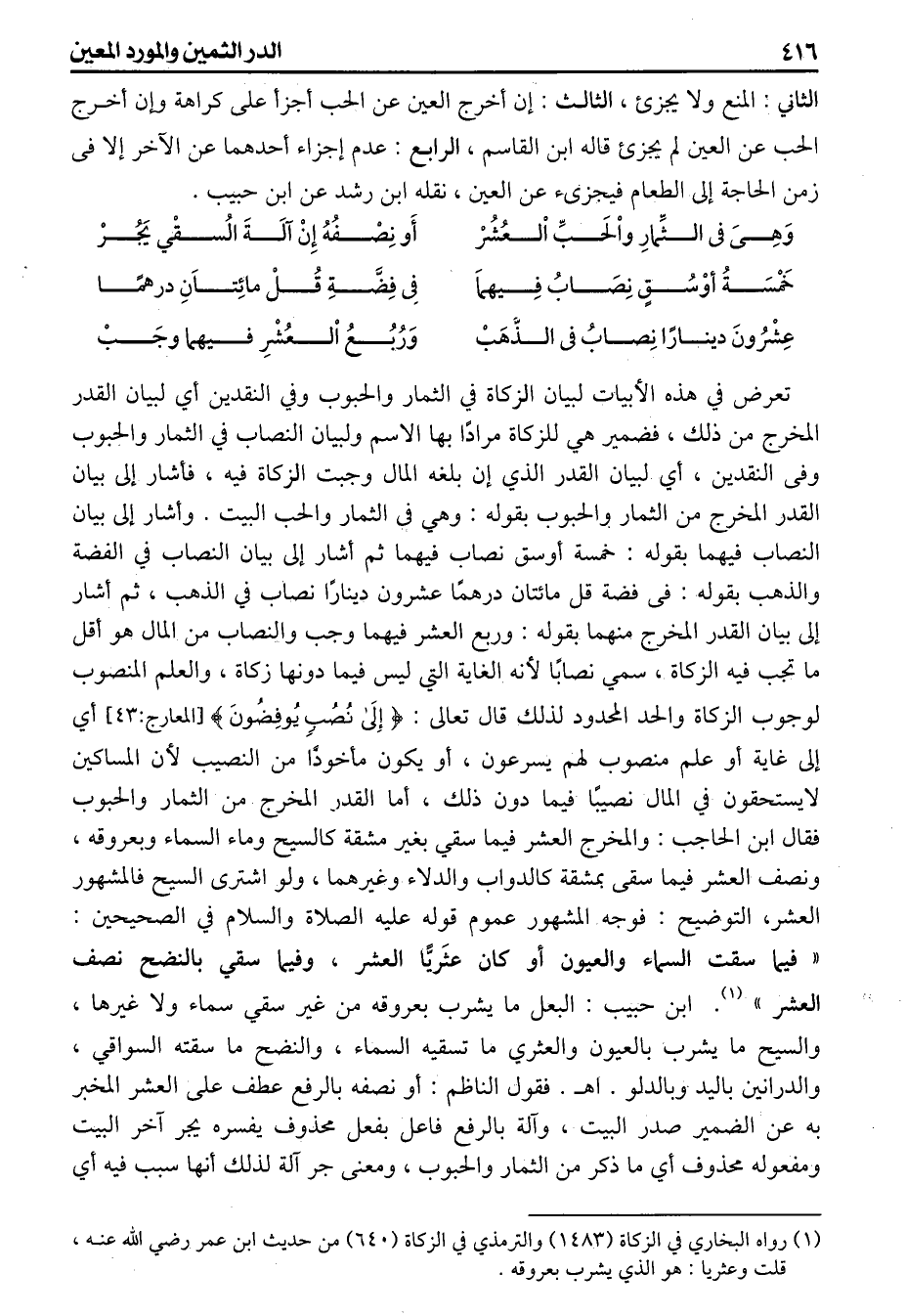 تعرض فيء هذا الأبيات لبيان الزكاة في الثمار والحبوب وفي النقدين أي لبيان القدر المخرج من ذلك فضمير هي للزكاة مرادا بها الإسم ولبيان النصاب في الثمار والحبوب وفى النقدين أي لبيان القدر الذي إن بلغه المال وجبت الزكاة فيه فأشار إلى بيان القدر المخرج من الثمار والحبوب بقوله وهي في الثمار والحب البيت وأشار إلى بيان النصاب فيهما بقوله (خمسة أوسق نصاب فيهما) ثم أشار إلى بيان النصاب (في الفضة والذهب بقوله فى فضة قل مائتان درهما عشرون دينارا نصاب في الذهب) ثم أشار إلى بيان القدر المخرج منهما بقوله (وربع العشر فيهما وجب) والنصاب من المال هو أقل ماتجب فيه الزكاة سمي نصابا لأنه الغاية التي ليس فيما دونها زكاة والعلم المنصوب لوجوب الزكاة والحد المحدود لذلك قال تعالى {إلى نصب يوفضون} أي إلى غاية أو علم منصوب لهم يسرعون أو يكون مأخوذا من النصيب لأن المساكين لايستحقون في المال نصيبا فيما دون ذلك أما القدر المخرج من الثمار والحبوب فقال ابن الحاجب والمخرج العشر فيما سقي بغير مشقة كالسيح وماء السماء وبعروقه ونصف العشر فيما سقى بمشقة كالدواب والدلاء وغيرهما ولو اشترى السيح فالمشهور العشر، لووعدم كمال ملكه من جهة أنه لايتصرف التصرف التام لا من جهة أن له انتزاع ماله إذ لايشمل المكاب ونحوه التوضيح فوجه المشهور عموم قوله عليه الصلاة والسلام في الصحيحين فيما سقت السماء والعيون أو كان عثريا العشر وفيما سقي بالنضح نصف العشر