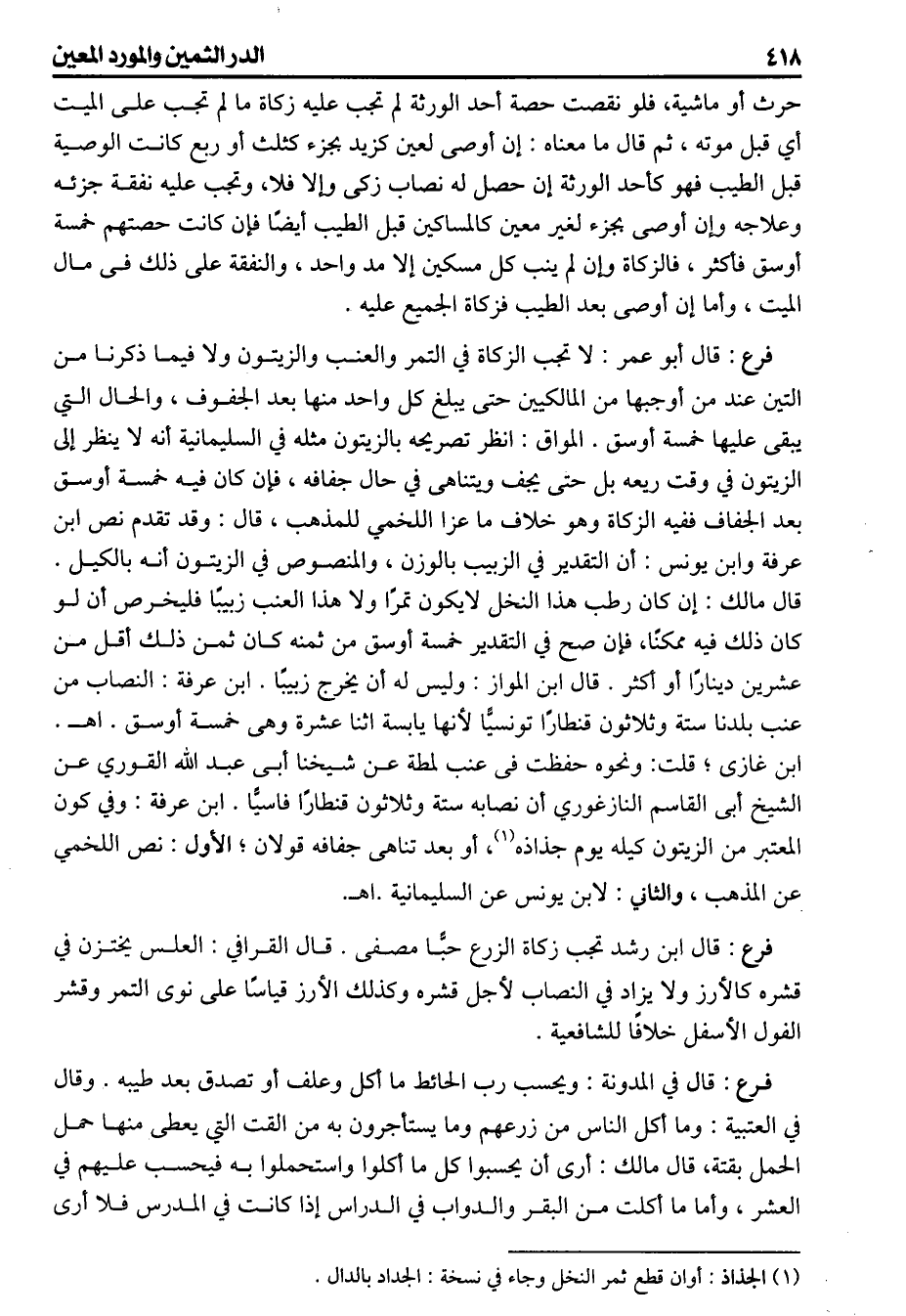 ابن غازى قلت: ونحوه حفظت فى عنب لمطة عن شيخنا أبى عبد الله القوري عن الشيخ أبى القاسم النازغوري أن نصابه ستة وثلاثون قنطارا فاسيا ابن عرفة وفي كون المعتبر من الزيتون كيله يوم جذاذه أو بعد تناهى جفافه قولان الأول نص للخمي عن المذهب والثاني لابن يونس عن السليمانية