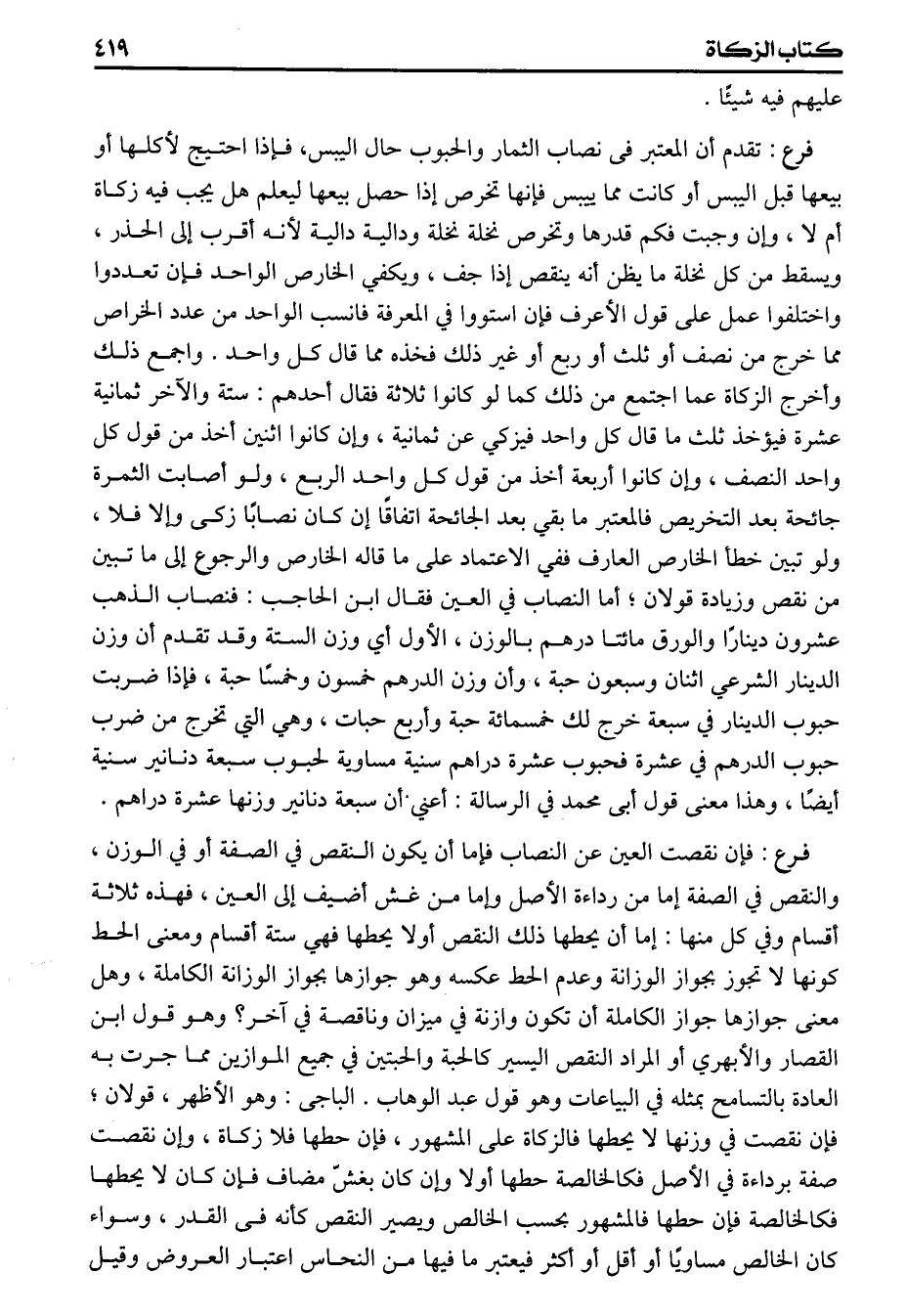 (فرع) تقدم أن المعتبر فى نصاب الثمار والحبوب حال اليبس، فإذا احتيج لأكلها أو بيعها قبل اليبس أو كانت مما ييبس فإنها تخرص إذا حصل بيعها ليعلم هل يجب فيه زكاة أم لا وإن وجبت فكم قدرها وتخرص نخلة نخلة ودالية دالية لأنه أقرب إلى الحذر ويسقط من كل نخلة مايظن أنه ينقص إذا جف ويكفي الخارص الواحد فإن تعددوا واختلفوا عمل قول الأعراف فإن استووا في المعرفة فانسب الواحد من عدد الخراص مما خرج من نصف أو ثلث أو ربع أو غير ذلك مما قال كل واحد وأجمع ذلك وأخرج الزكاة عما اجتمع من ذلك كما لو كانوا ثلاثة فقال أحدهم ستة والآخر ثمانية عشرة فيؤخذ ثلث ماقال كل واحد فيزكي عن ثمانية وإن كانوا اثنين أخذ من قول كل واحد النصف وإن كانوا أربعة أخذ من قول كل واحد الربع ولو أصابت الثمرة جائحة بعد التخريص فالمعتبر مابقي بعد الجائحه اتفاقا إن كان نصابا زكى وإلا فلا ولو تبين خطأ الخارص العارف ففي الاعتماد على ماقاله الخارص والرجوع إلى ما تبين من نقص وزيادة قولان. لووعدم كمال ملكه من جهة أنه لايتصرف التصرف التام لا من جهة أن له انتزاع ماله إذ لايشمل المكاب ونحوه أما النصاب في العين فقال ابن الحاجب فنصاب الذهب عشرون دينارا والورق مائتا درهم بالوزن الأول أي وزن السنة وقد تقدم أن وزن الدينار الشرعي اثنان وسبعون حبة وأن وزن الدرهم خمسون وخمسا حبة فإذا ضربت حبوب الدينار في سبعة خرج لك خمسمائة حبة وأربع حبات وهي التي تخرج من ضرب حبوب الدرهم في عشرة فحبوب عشرة دراهم سنية مساوية لحبوب سبعة دنانير سنية أيضا وهذا معنى قول أبى محمد في الرسالة أعنيء أن سبعة دنانير وزنها عشرة دراهم