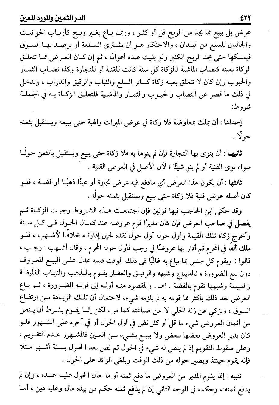 عرض بل يبيع مما يجد من الربح قل أو كثر وربما باع بغير ربح كأرباب الحوانيت والجالبين للسلع من البلدان والاحتكار هو أن يشترى السلعة أو يرصد بها السوق فيمسكها حتى يجد الربح الكثير ولو بقيت عنده أعواما ثم إن كان العرض مما تتعلق الزكاة بعينه كنصاب الماشية فالزكاة كل سنة كانت للقنية أو للتجارة وكذا نصاب الثمار والحبوب وإن كان لاتتعلق بعينه زكاة كسائر السلع والثياب والرقيق والدواب ويدخل في ذلك ماقصر عن النصاب والحبوب والثمار والماشية فتتعلق الزكاة به في الجملة شروط